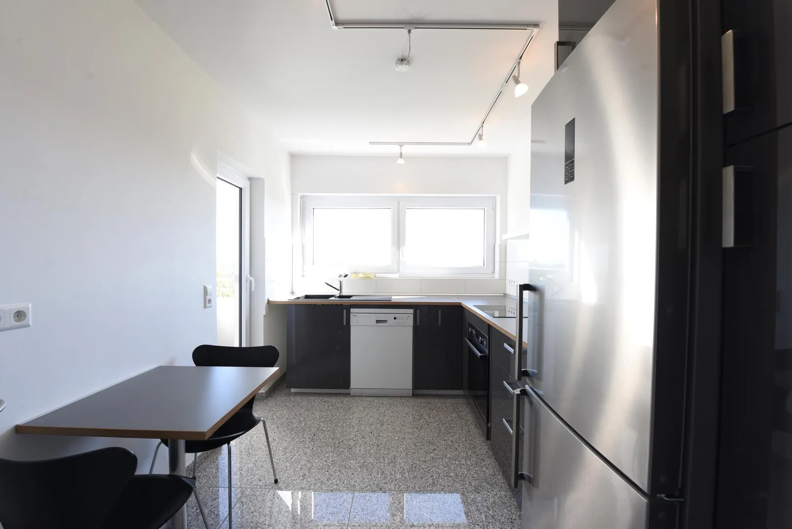 Die Einbauküche von 2014 verfügt über einen Herd mit Backofen, einen Kühlschrank, einen Gefrierschrank, eine Spülmaschine sowie Unter- und Oberschränke.