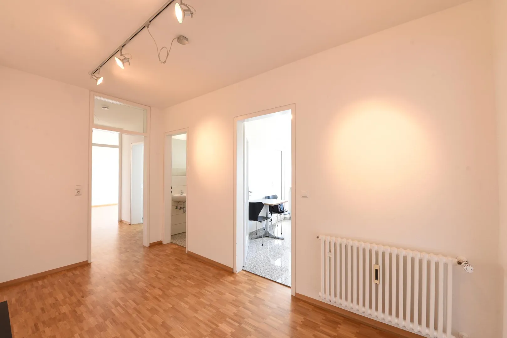 Die Wände sind mit Raufasertapeten tapeziert und weiß gestrichen. Vereinzelt sind Malerarbeiten beim Einzug notwendig.
