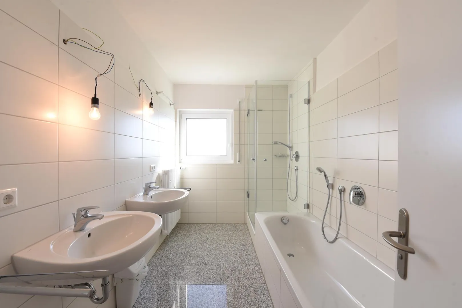 Das 2/3-hoch geflieste Badezimmer ist ausgestattet mit einer Badewanne, einer Dusche sowie mit zwei Waschbecken.