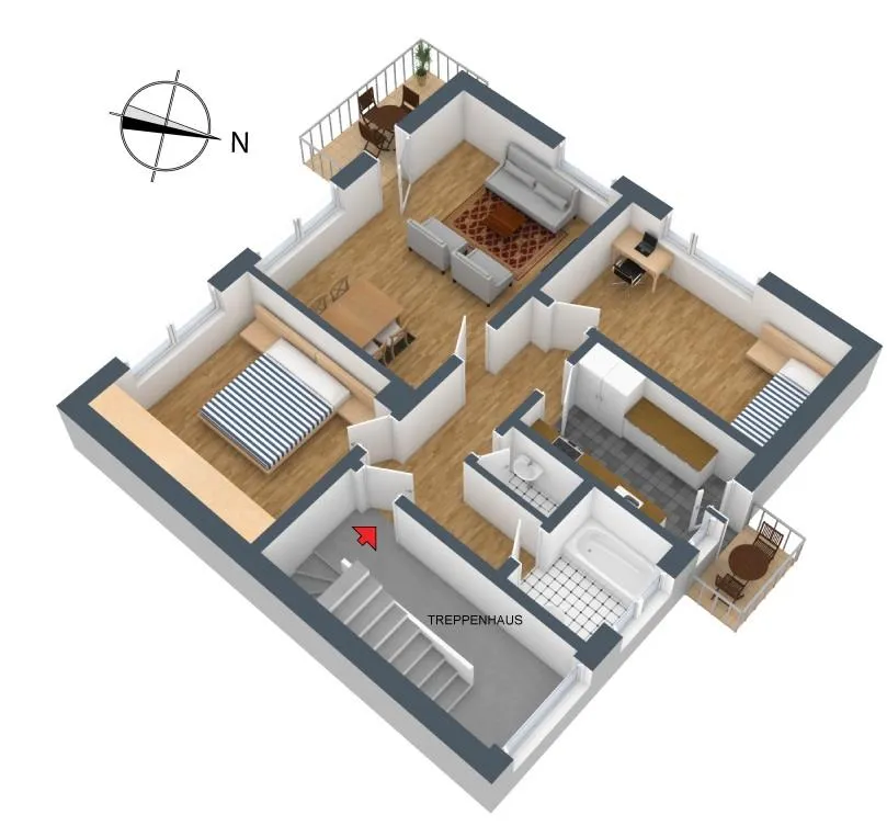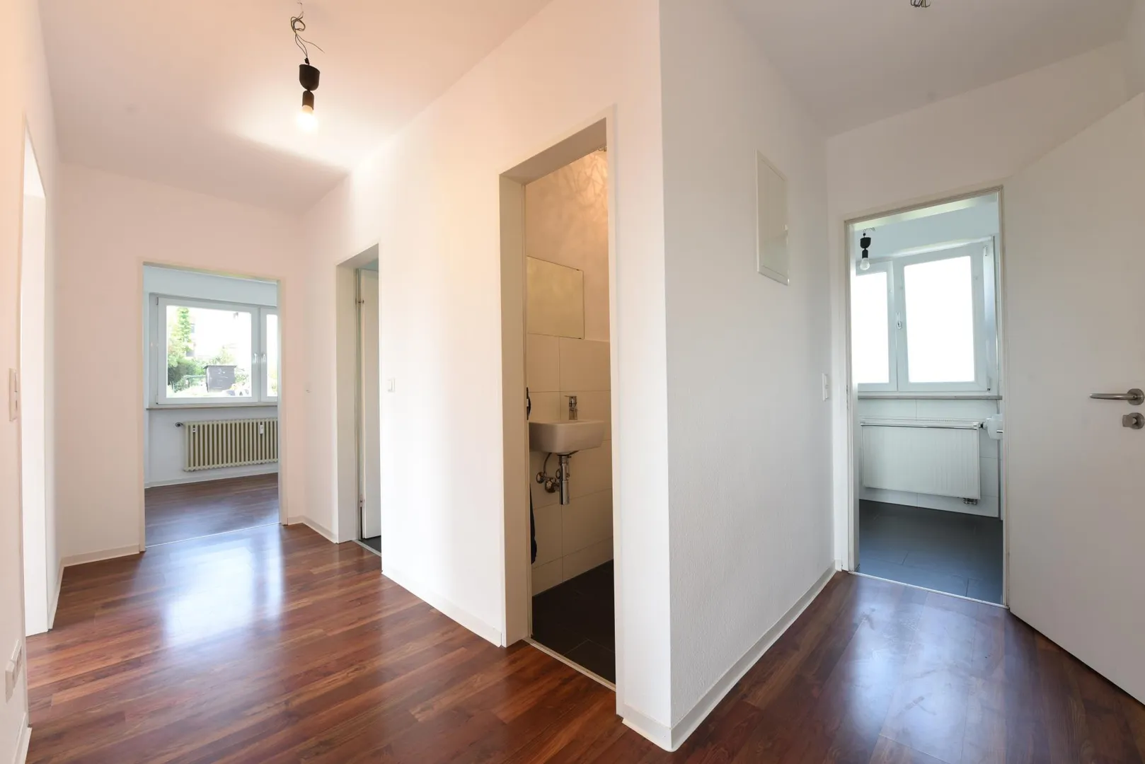 Der Grundriss ist sehr gut. Alle Räume sind direkt vom Flur begehbar. Das Badezimmer verfügt über ein Fenster. Das WC ist separat. Ein Küchen-Balkon befindet sich auf der Nord/Ost-Hausseite. Der Süd/West-Balkon ist über das Wohnzimmer begehbar.