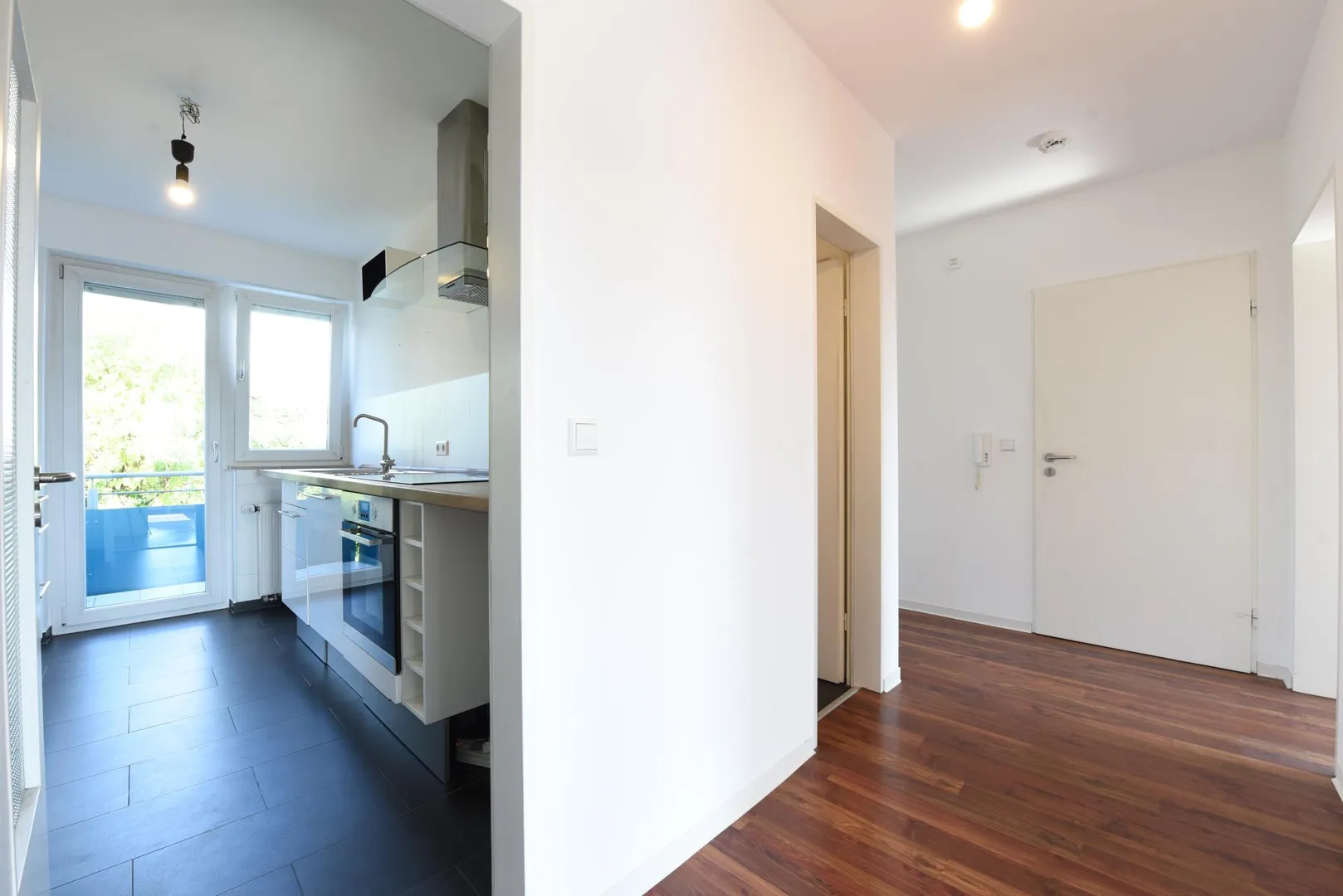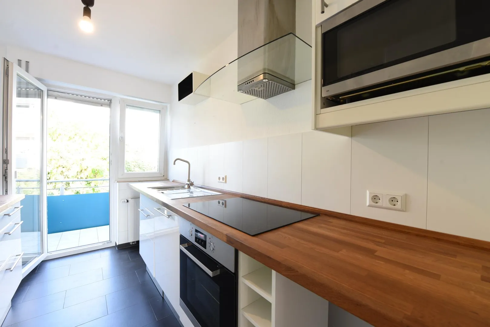 In der Küche befindet sich eine hochwertige Einbauküche mit weißen Hochglanz-Fronten und Induktions-Herd, ohne Kühl-/Gefrierschrank, welche vom Vormieter für 4.500 EUR (VB) übernommen werden kann.