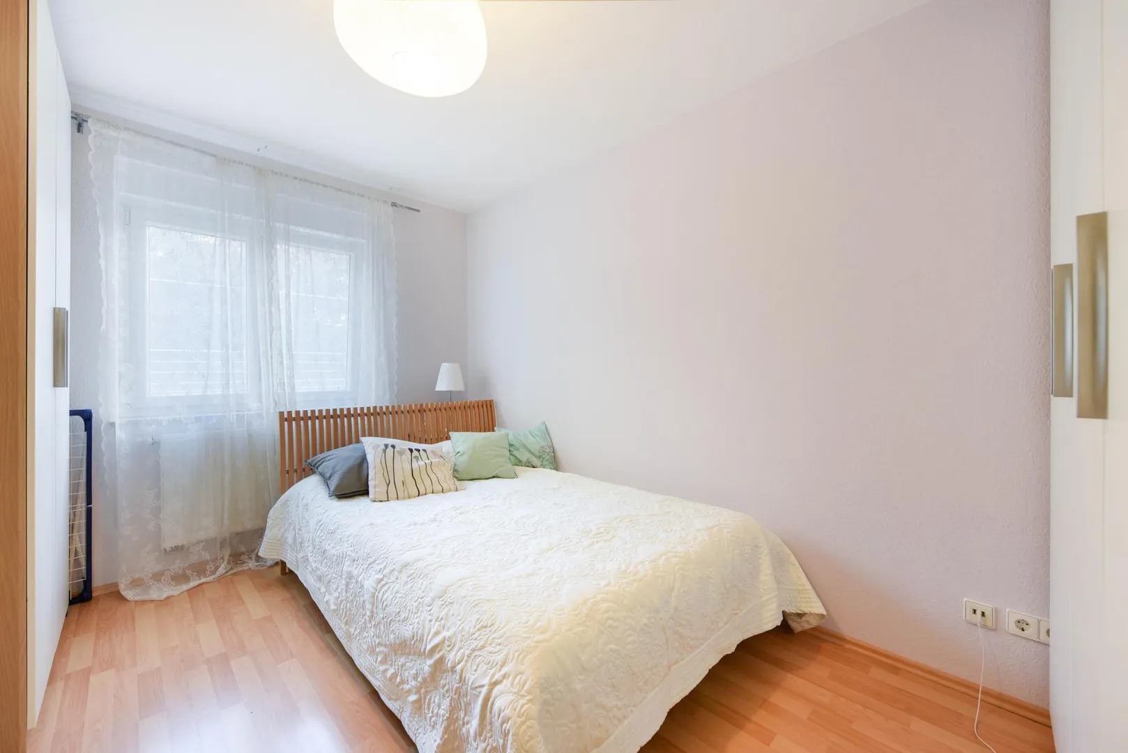 Die Böden in der Küche, im Flur und im Bad sind gefliest. In den Zimmer ist Laminat-Boden verlegt.