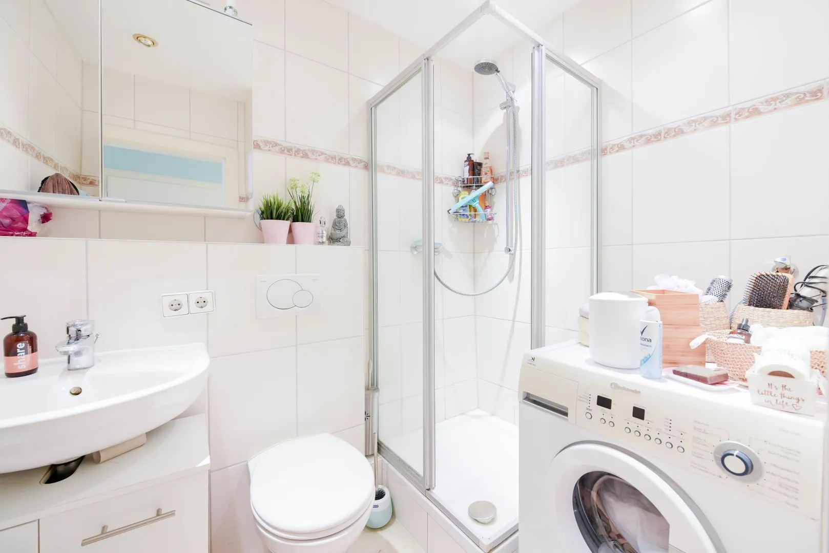 Das raumhoch geflieste Badezimmer ist ausgestattet mit einer Dusche, einem WC, einem Handtuch-Heizkörper, einem Waschmaschinen-Anschluss sowie einem Spiegelschrank.