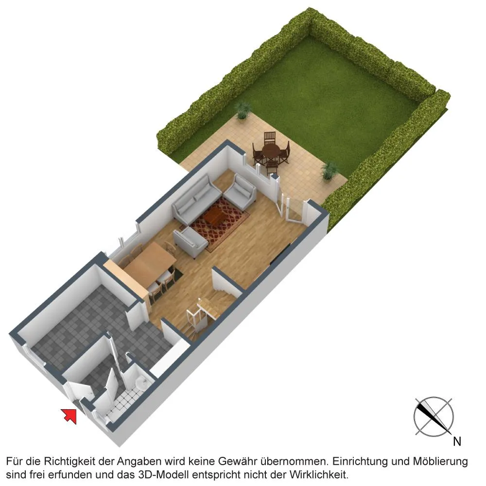 Erdgeschoss: Hauseingang, Windfang, Garderobe, separates WC mit Fenster, Küche mit Einbauküche, Wohn-/Essbereich, überdachte Terrasse, Garten. Raumhöhe ca. 2,42 Meter.