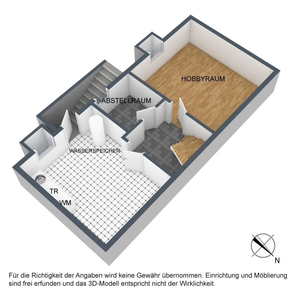 Untergeschoss: Technikraum mit separatem Außenaufgang, Abstellraum, Hobbyraum. Raumhöhe ca. 2,23 Meter.