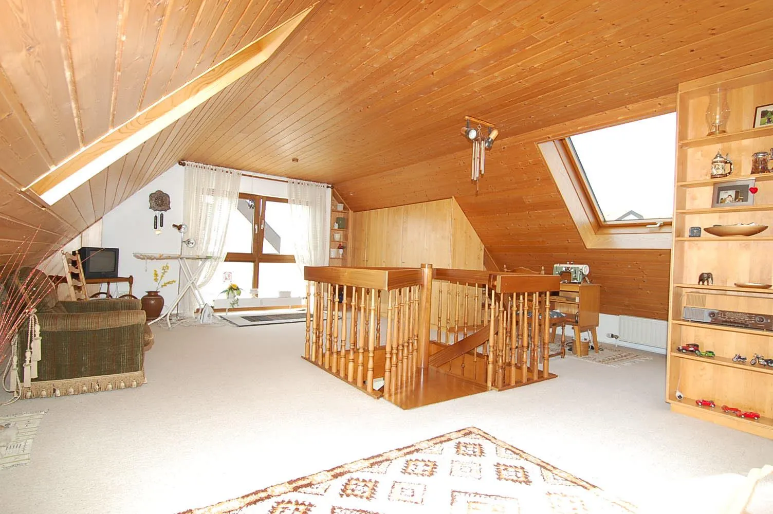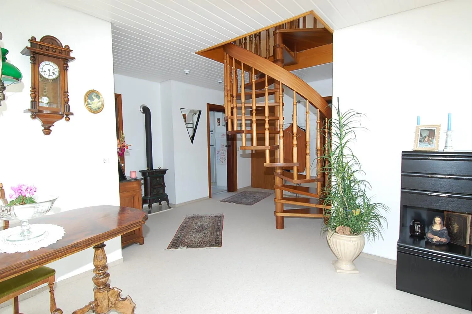 Eine Massiv-Holz Wendeltreppe verbindet die beiden Geschosse miteinander.