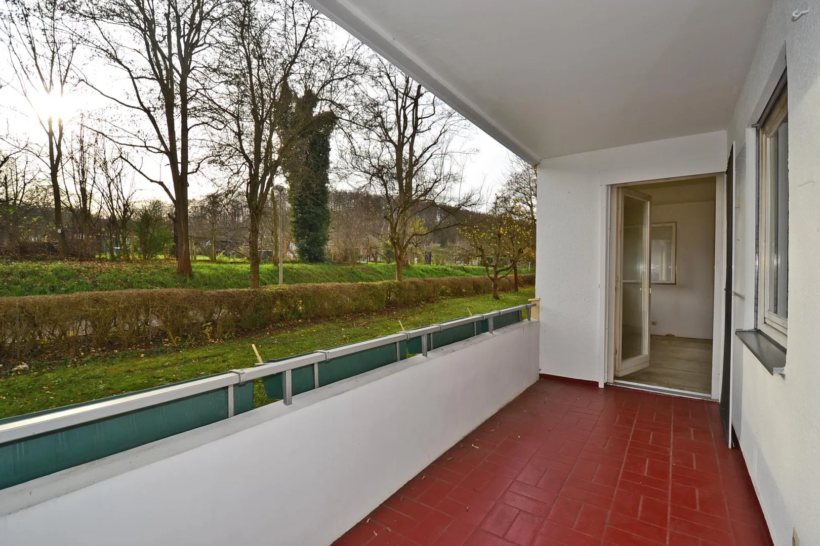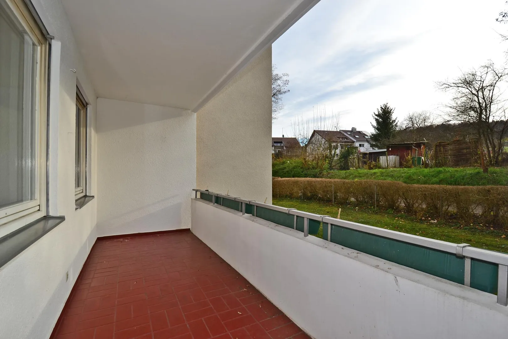 Vom ca. 28 m² großen und sonnigen Wohnzimmer gelangen Sie auf den Balkon. Dieser ist überdacht und nach Süden ausgerichtet mit schönem Blick ins Grüne. Der Balkon ist mit Steinboden in Ziegel-Optik und Steckdose ausgestattet.