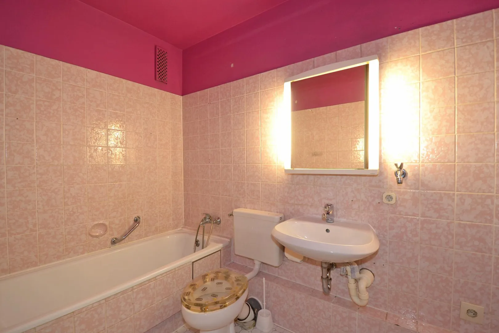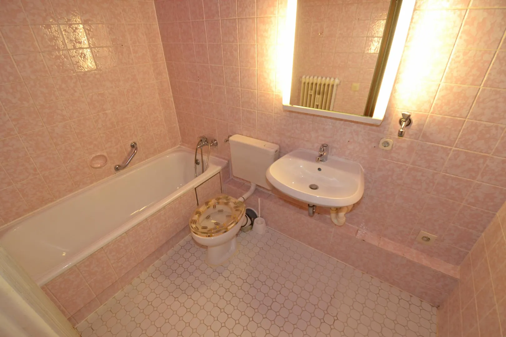 Das innenliegende Bad ist baujahrstypisch in rosé gefliest und mit Badewanne, Waschbecken und WC ausgestattet. Im Bad befindet sich auch der Waschmaschinenanschluss.