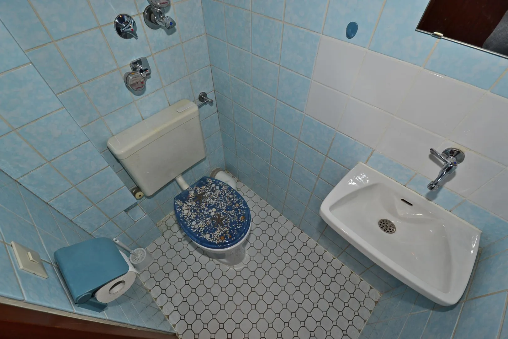 Nahe des Eingangs befindet sich das separate Gäste-WC. Dieses ist aktuell in blau gefliest und mit Waschbecken ausgestattet.