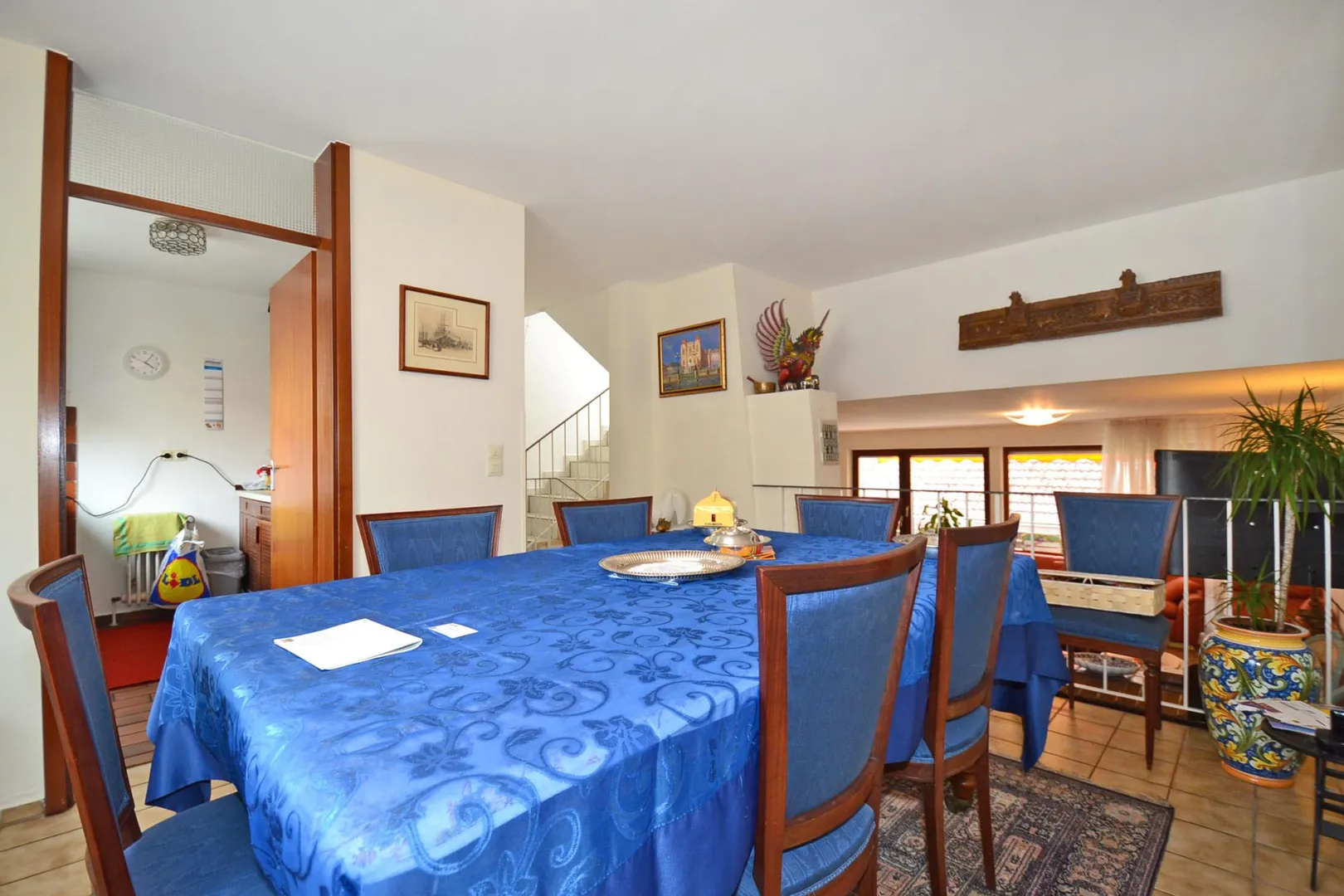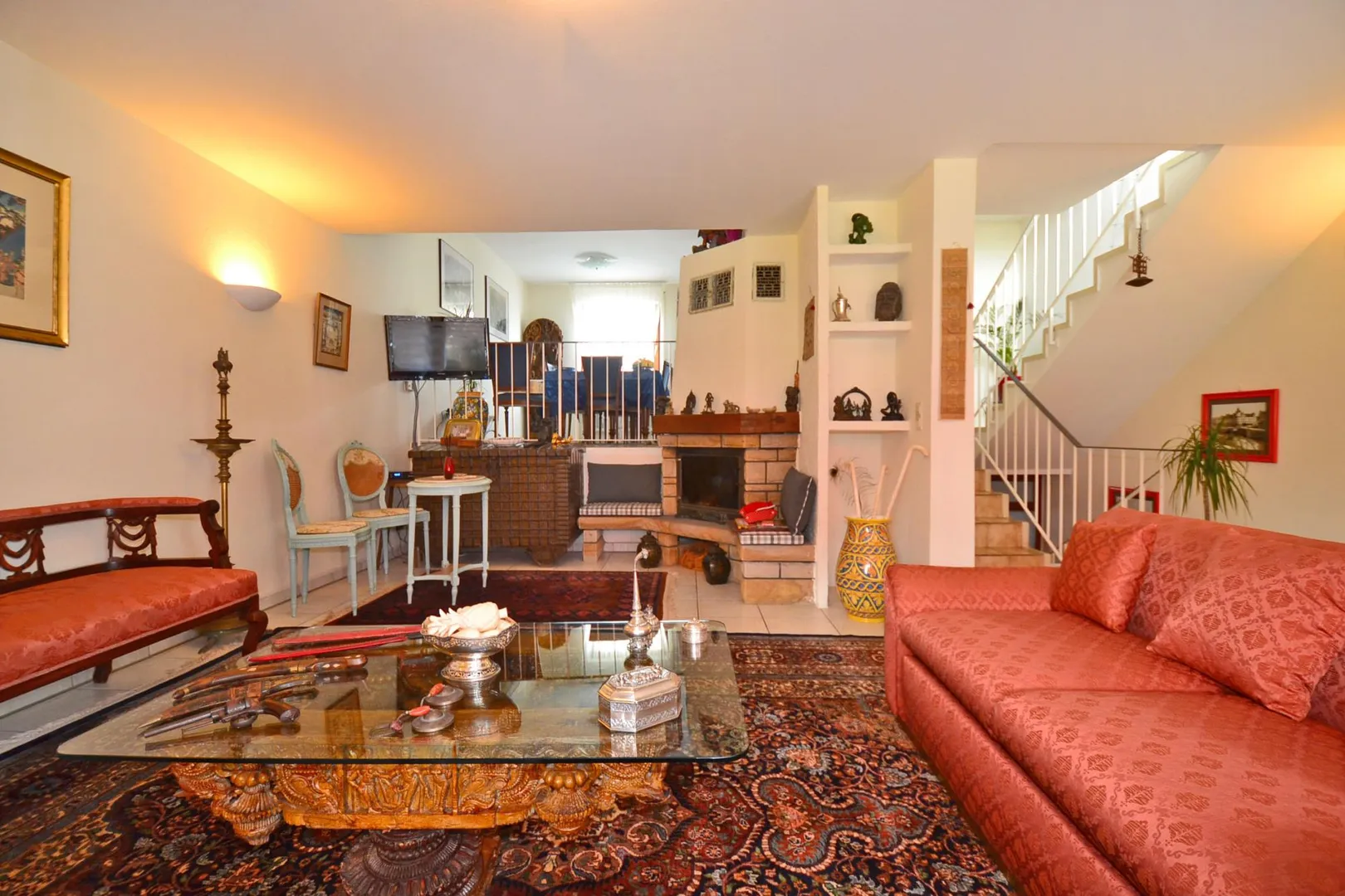 Das Haus ist ausgestattet mit einem offenen Kamin, einer Dachterrasse sowie einem breiten Süd-Balkon mit einem Treppenabgang zum kleinen Garten.