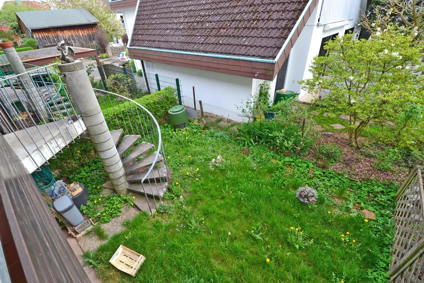 Über eine Wendeltreppe gelangen Sie vom Balkon zur kleinen und ruhig gelegenen Gartenfläche.