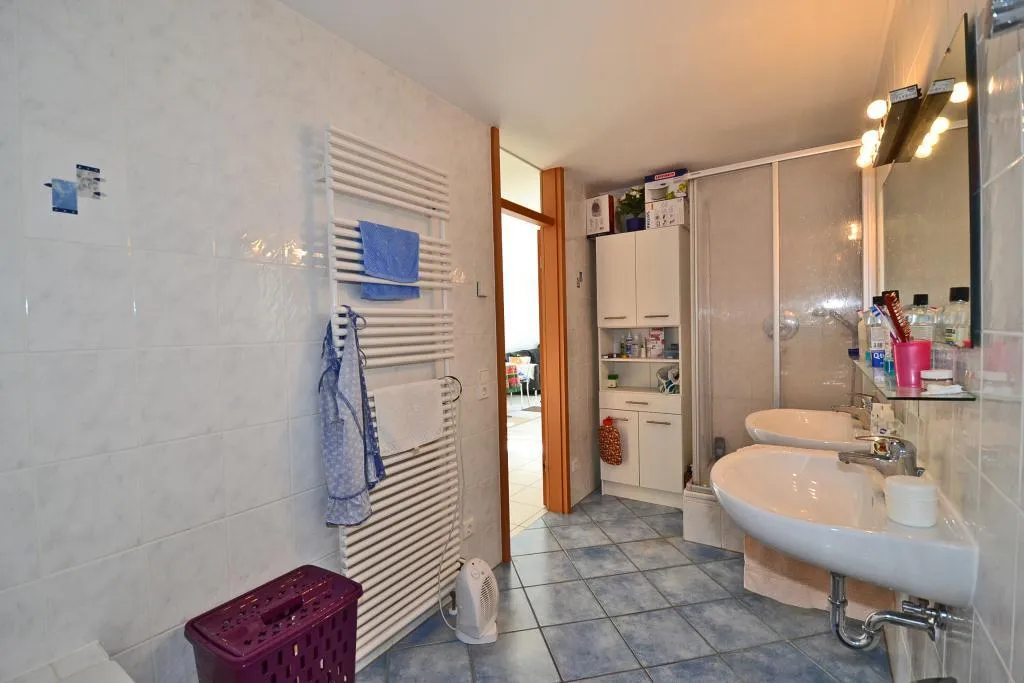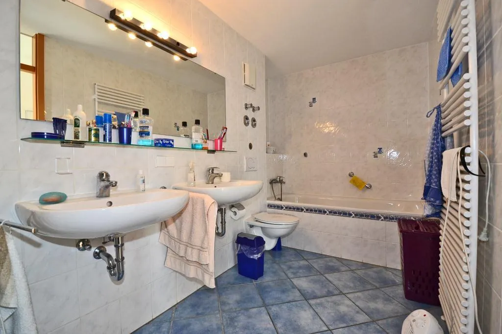 Das großzügige Badezimmer ist raumhoch gefliest und ist ausgestattet mit einer Badewanne, einer Dusche, zwei Waschbecken sowie einem Handtuchheizkörper.