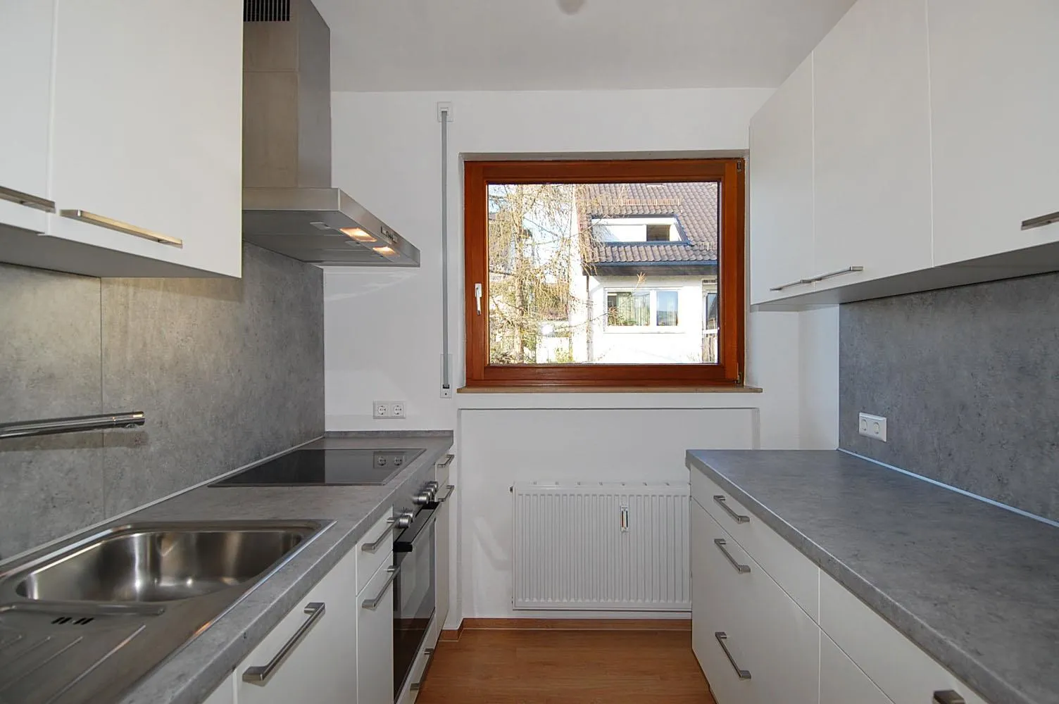 Die Küche verfügt über eine neuwertige Einbauküche von 2012. Diese ist u.a. ausgestattet mit Cerankochfeld und Backofen, Umluft-Dunstabzug, Kühlschrank mit separatem Gefrierfach, Spülmaschine sowie ausreichend Stauraum in Ober- und Unterschränken.