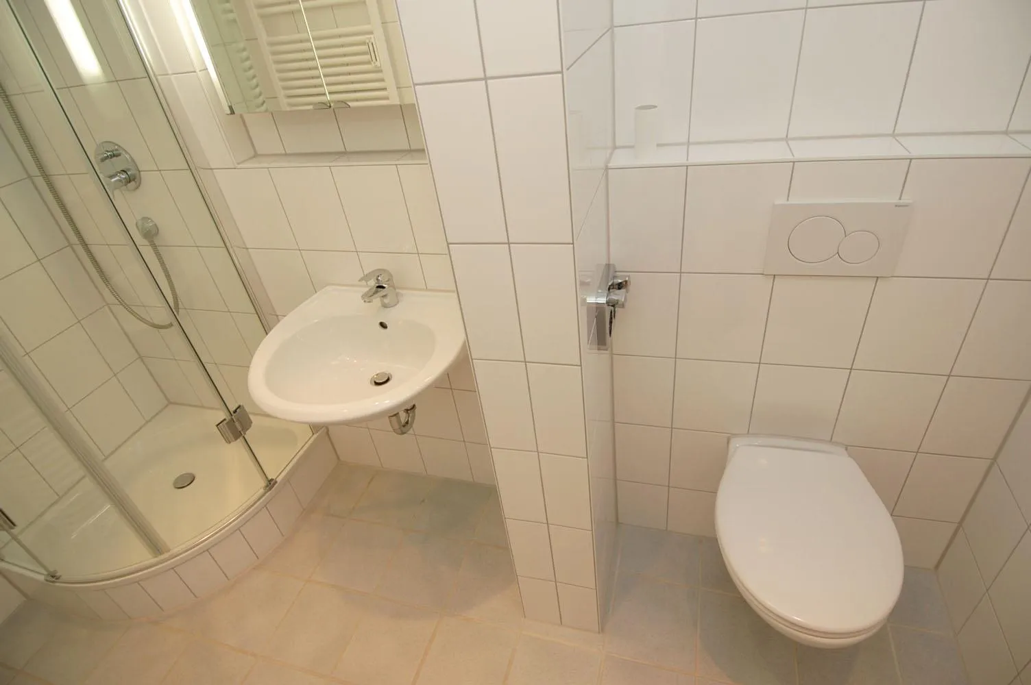 Das Badezimmer ist raumhoch weiß gefliest und mit Fliesenboden, Dusche, Waschbecken, WC, Handtuchhalter-Heizkörper, Spiegelschrank und integrierten Deckenleuchten ausgestattet.