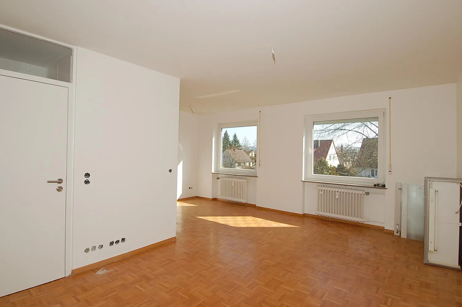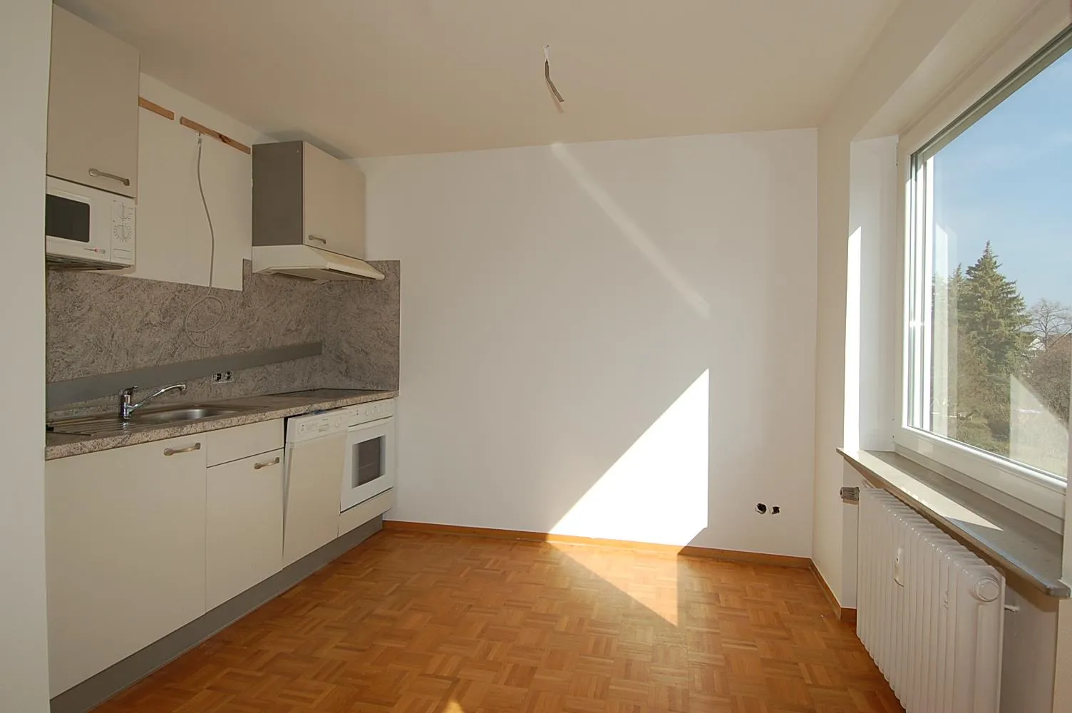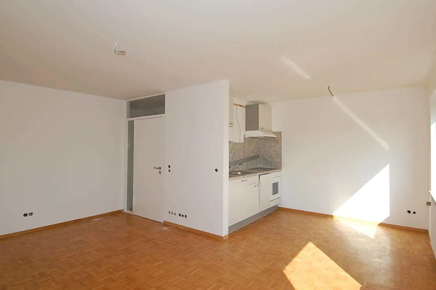 Das modernisierte Apartment ist mit Parkettboden und weißen Glasfasertapeten ausgestattet.