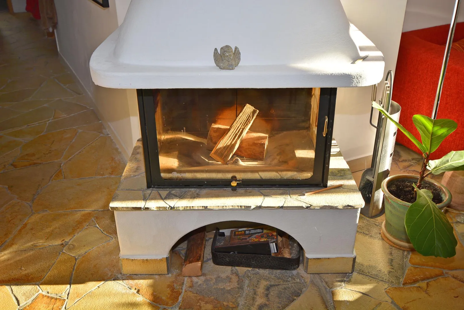 Ein Highlight im Wohnzimmer ist der holzbefeuerte Kamin.