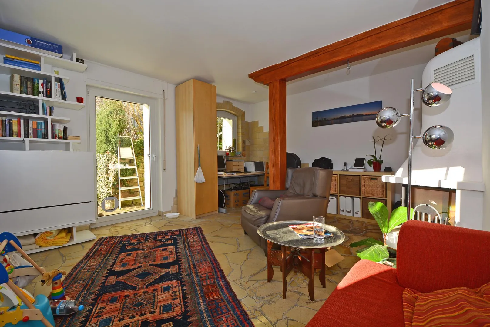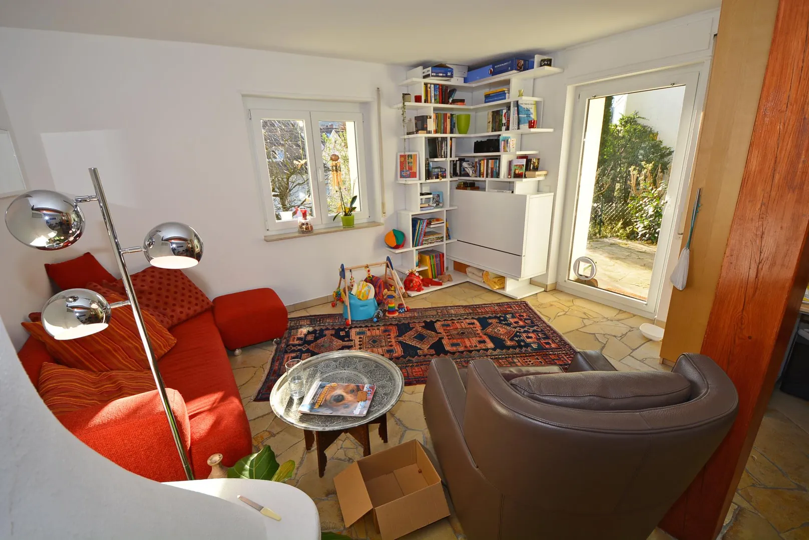 Das Wohnzimmer ist nach Süden und Westen ausgerichtet und hat einen Zugang zu Terrasse und Garten.