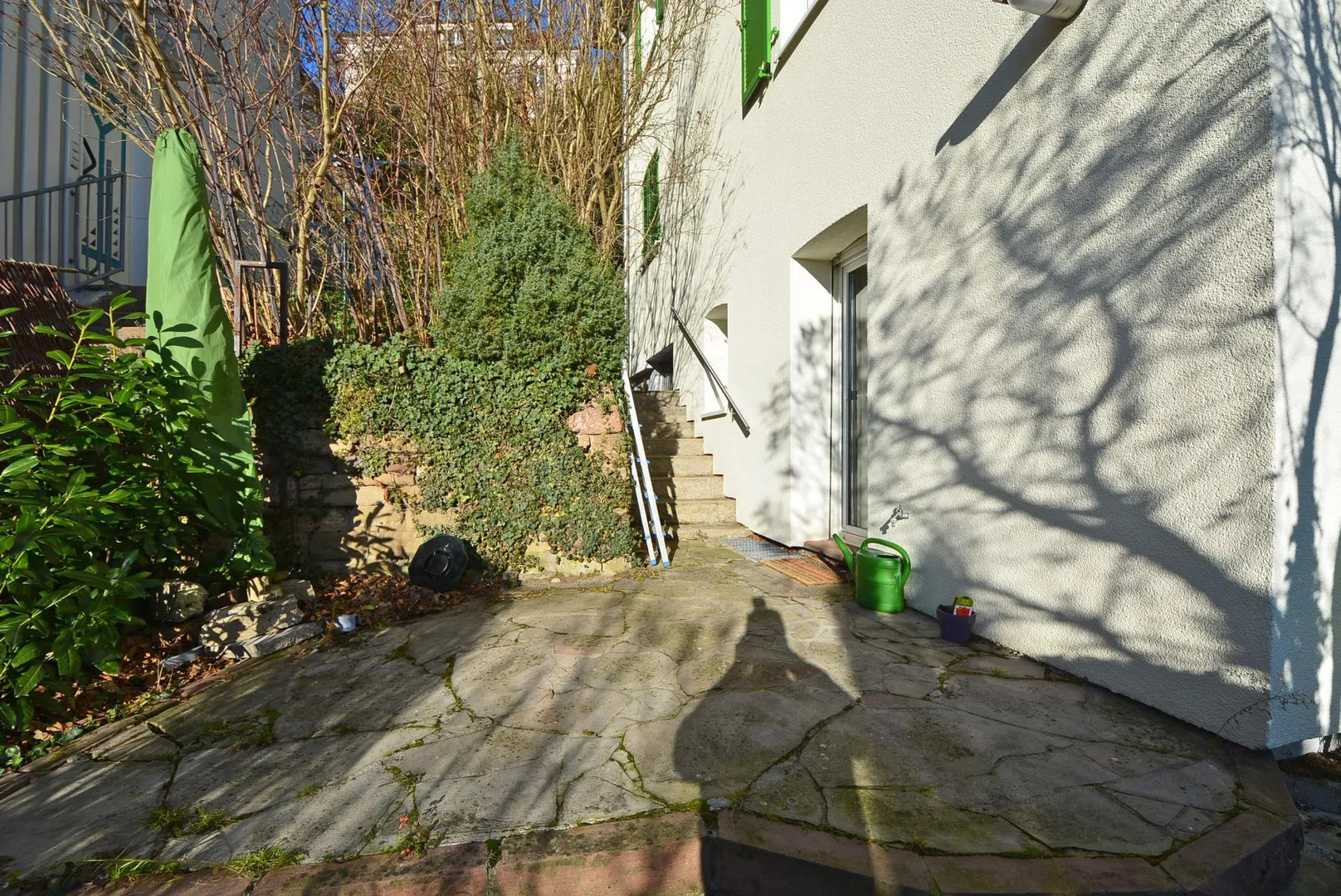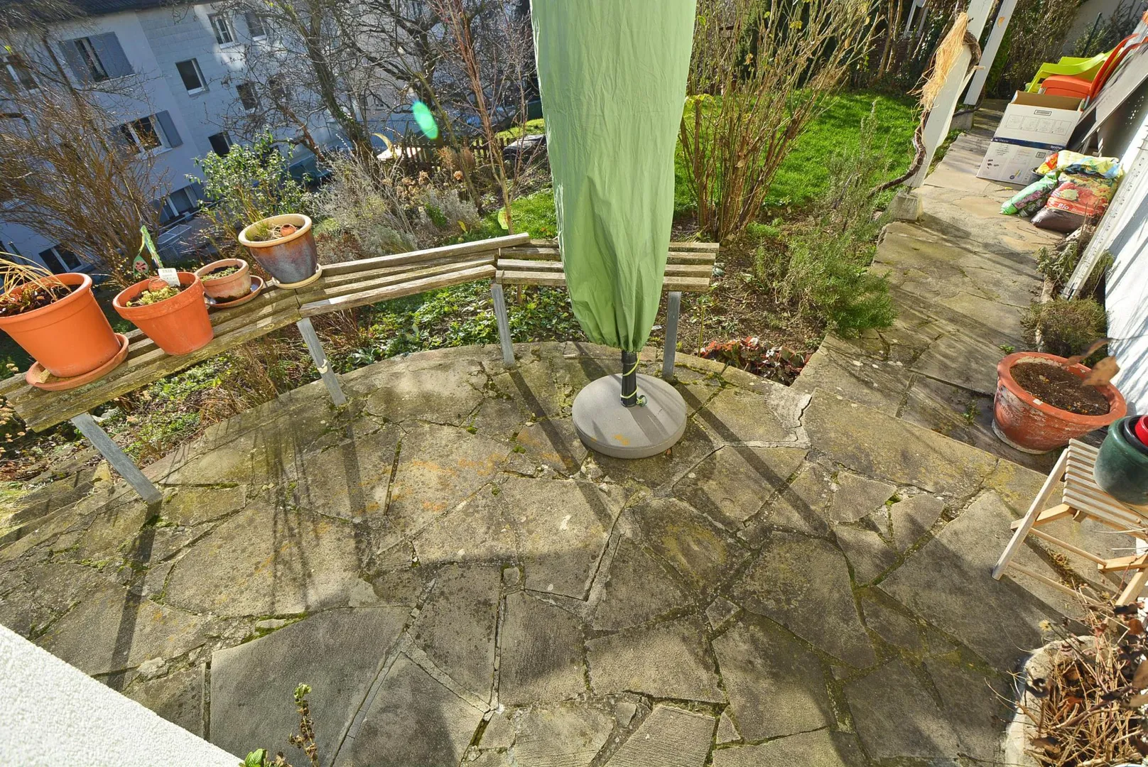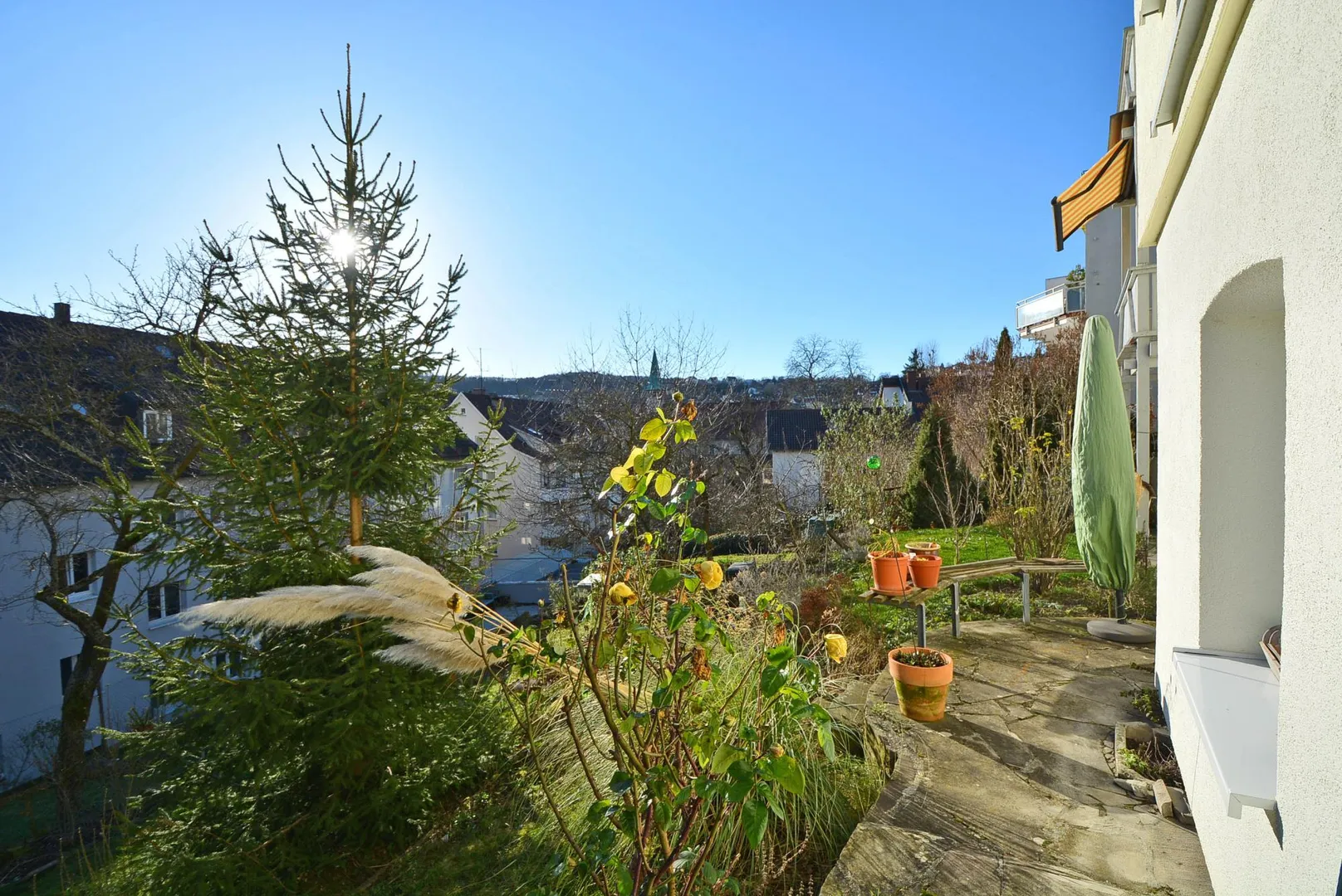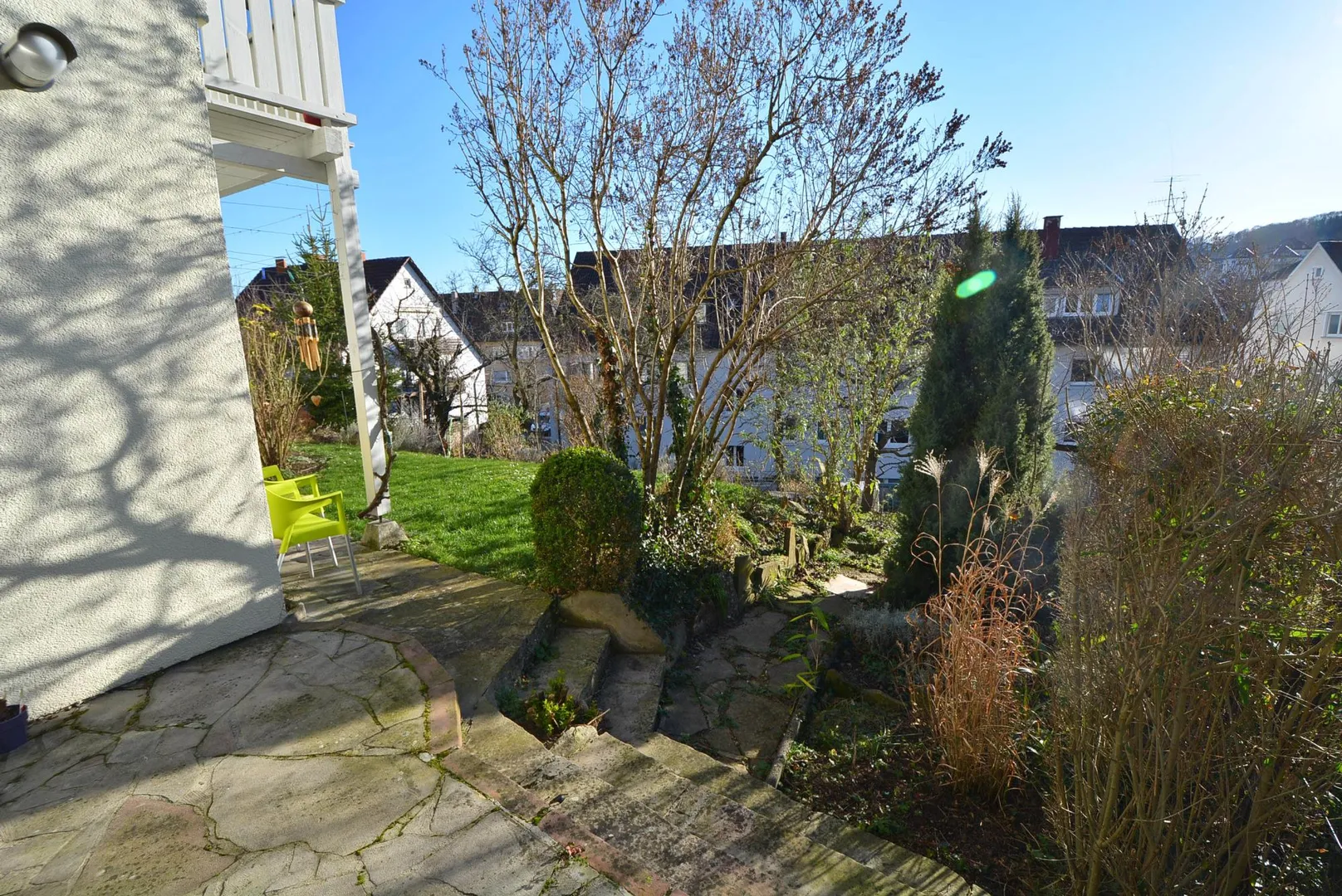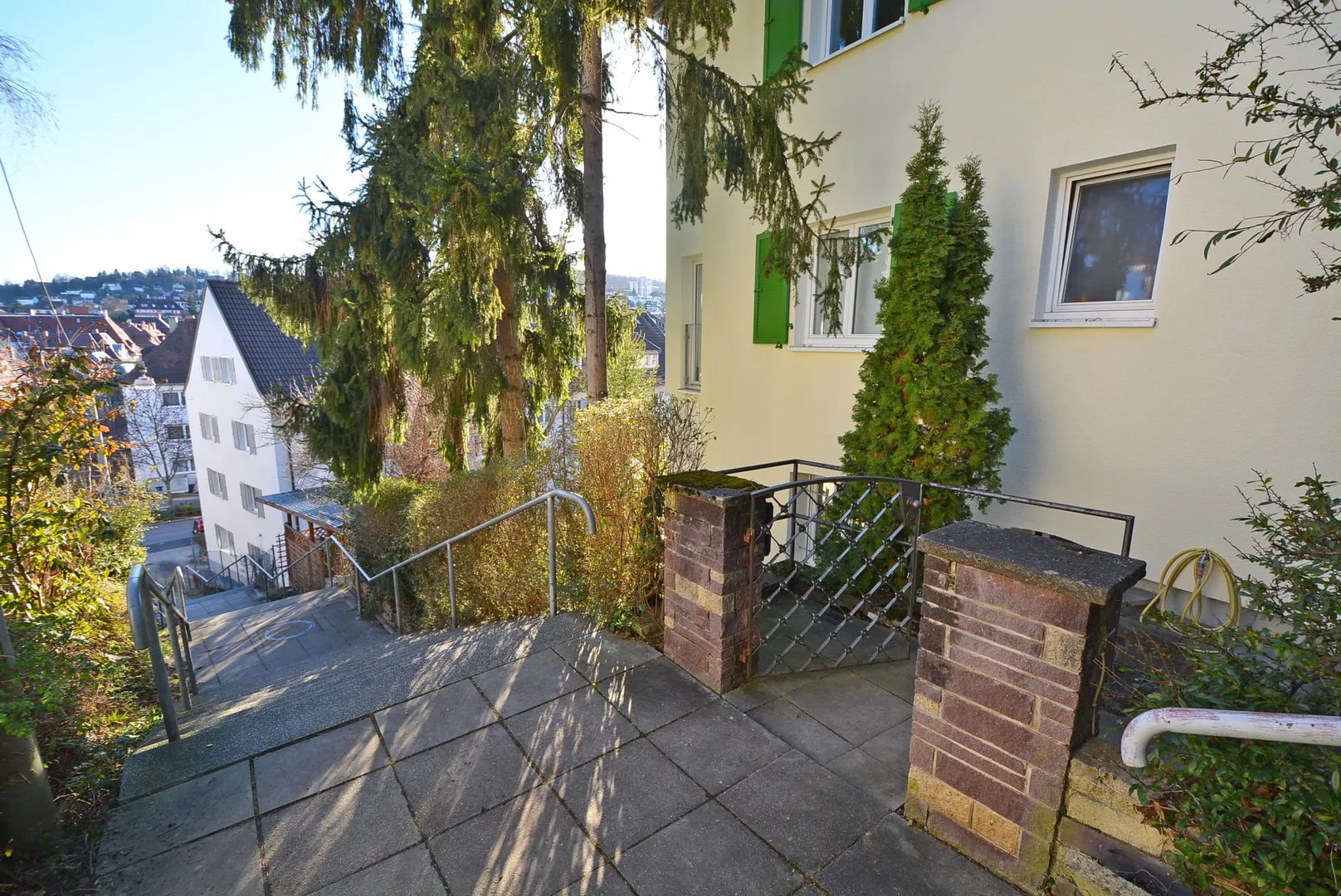 Durch die Hanglage gehen Sie von der Haustür zur Wohnung eine halbe Etage abwärts.