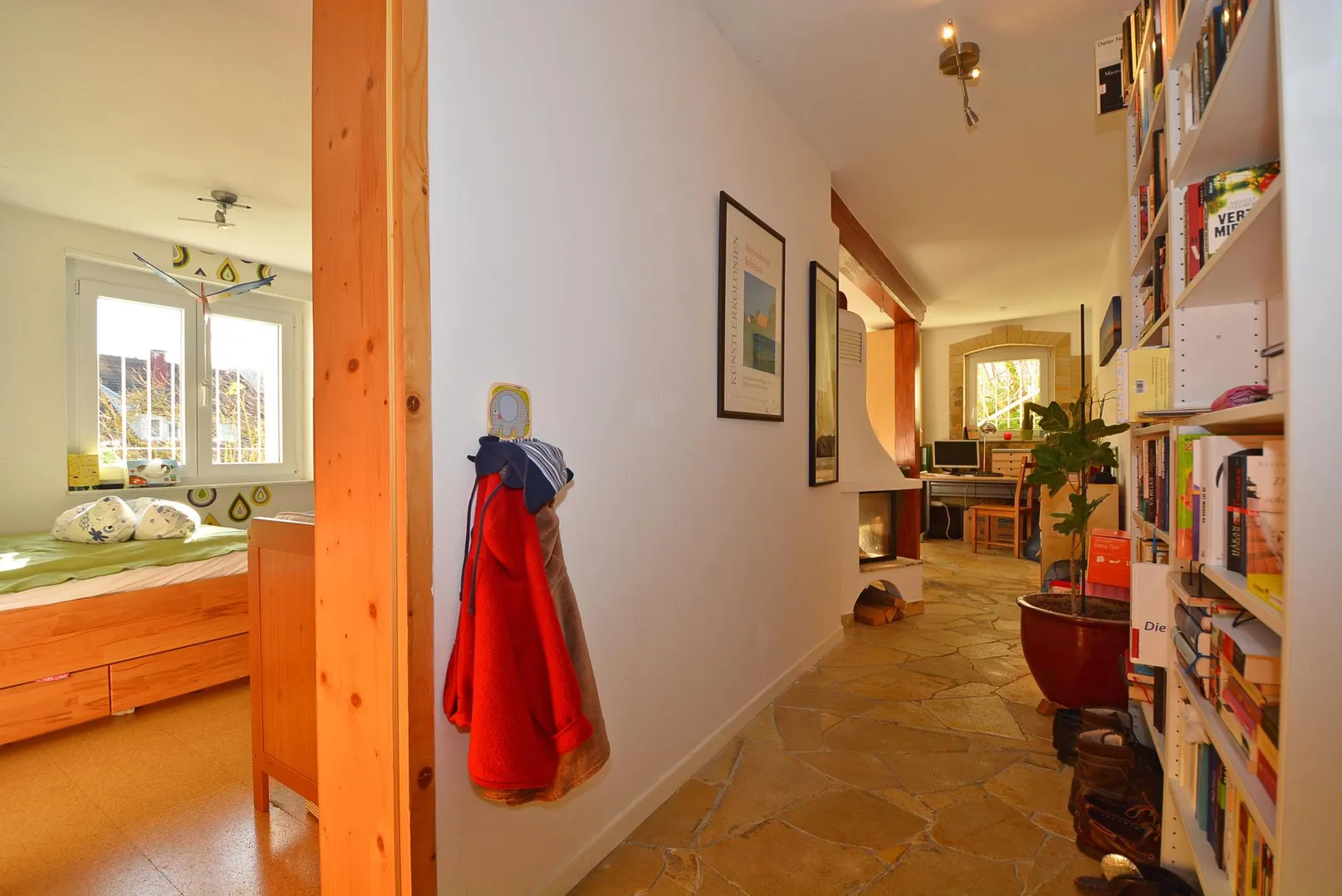In Flur und Wohnzimmer ist Natursteinboden verlegt, im Schlafzimmer Kork und in der Küche großflächige dunkelbraune Fliesen.