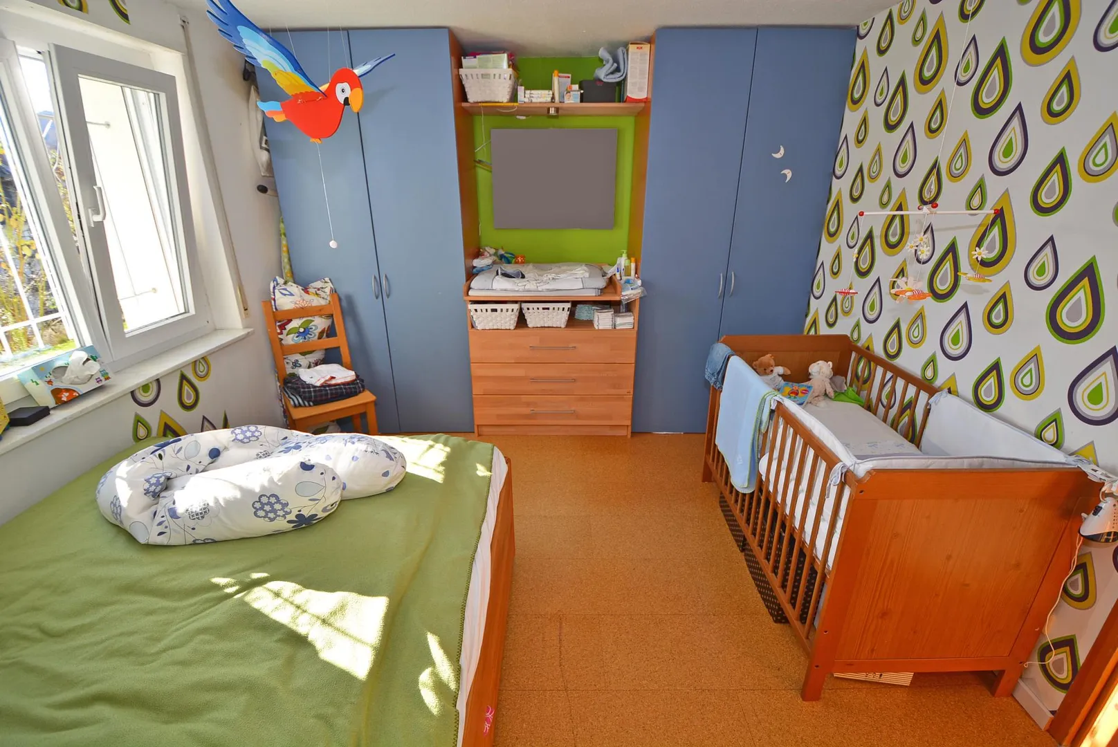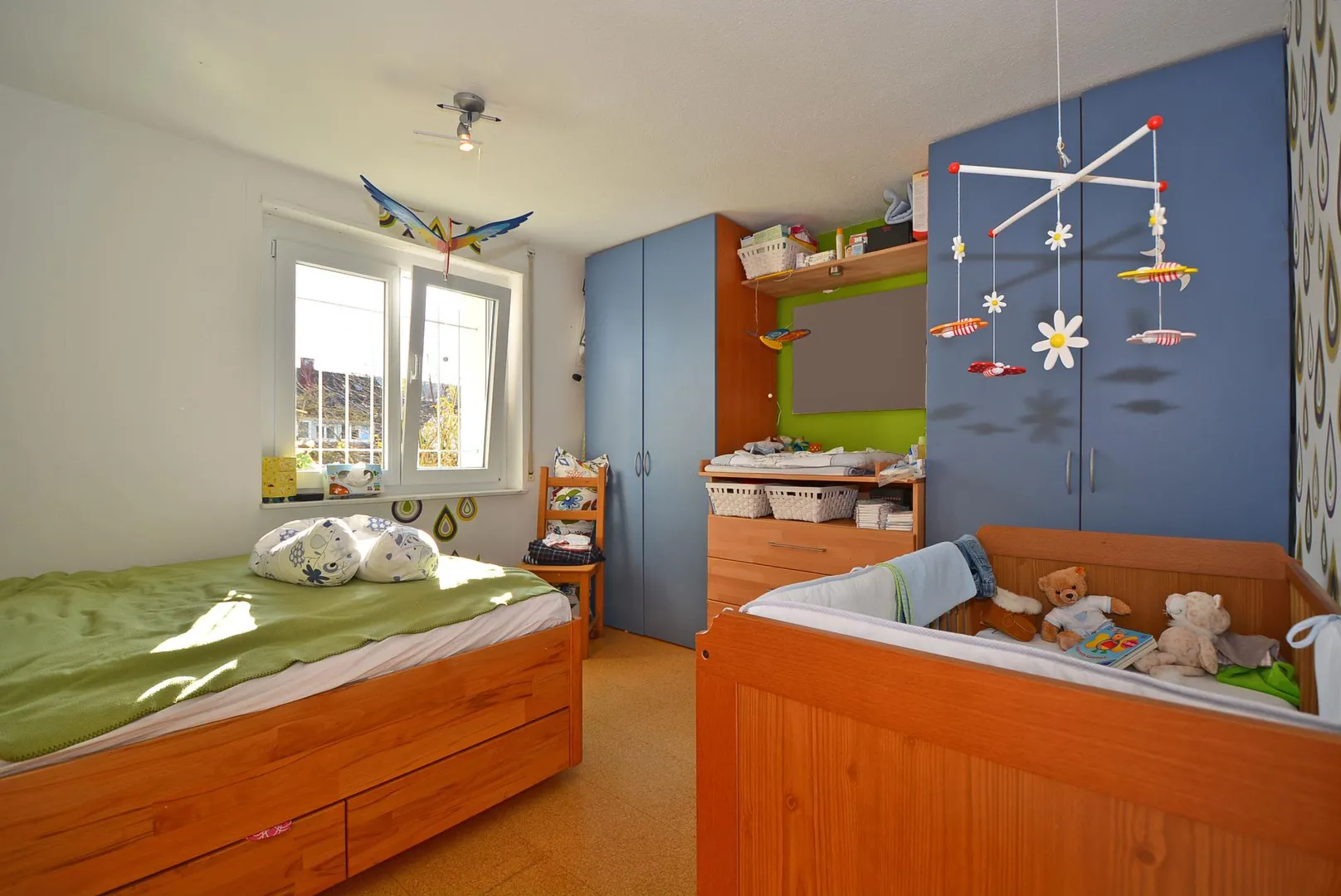Die Wände sind überwiegend mit weißen Vliestapeten und zum Teil mit Motivtapeten ausgestattet.
