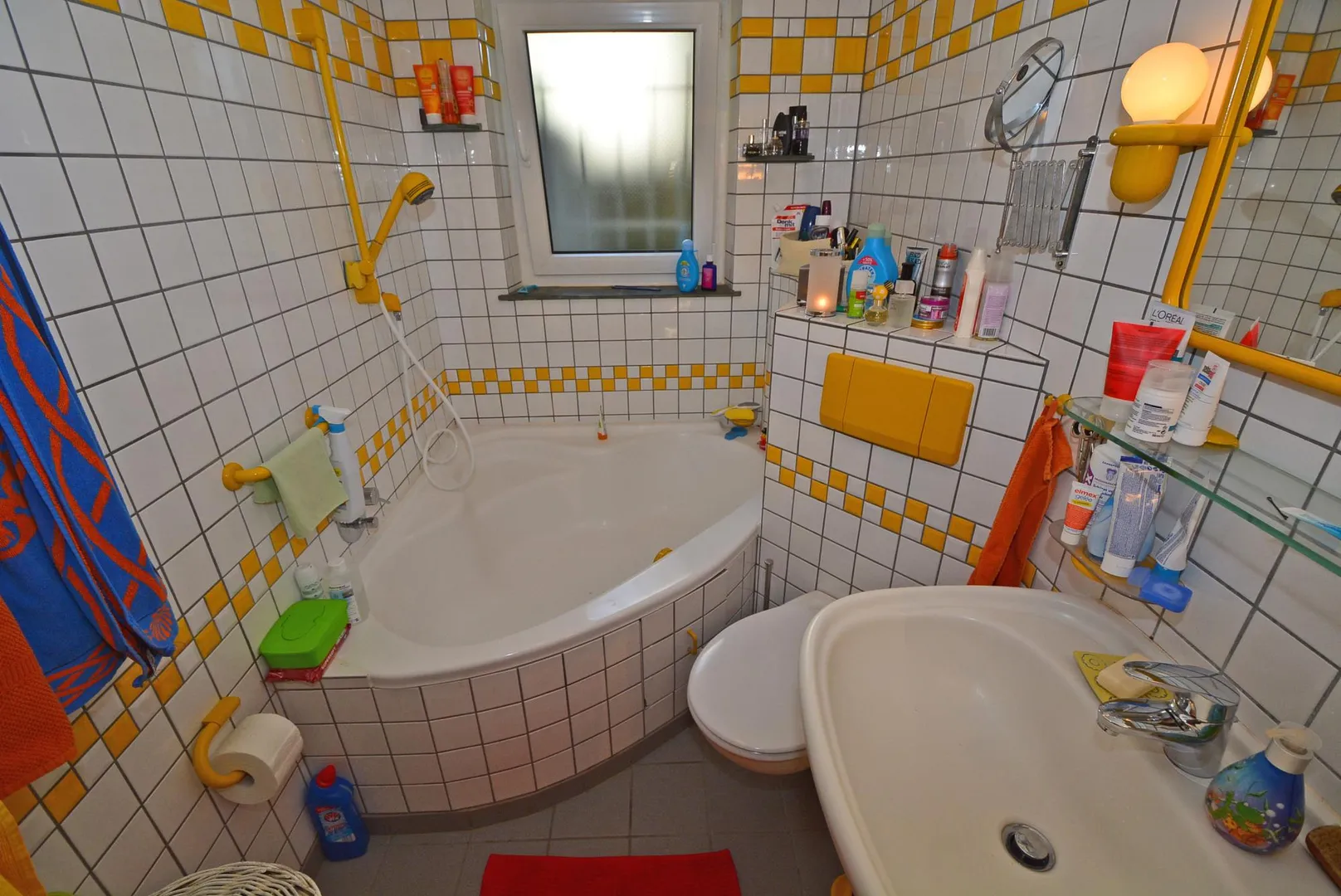 Es ist im Stil der 90er Jahre in weiß mit gelben Akzenten gefliest und ausgestattet mit Eckbadewanne, Waschbecken, WC und Fenster.