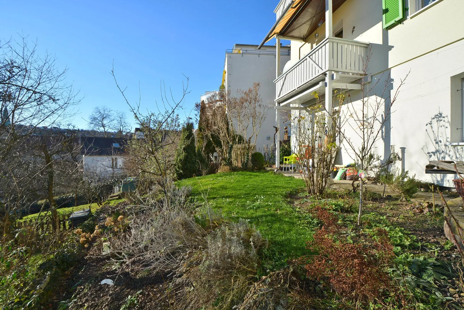 Die Gartenfläche besteht aus Rasen und schräger Hangfläche, die aktuell mit Ziersträuchern bepflanzt ist.