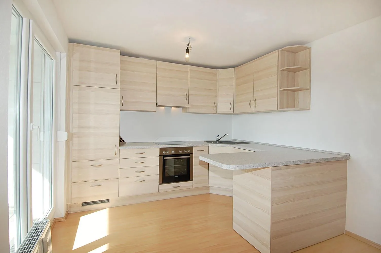 Die Küche ist zum Wohnbereich hin offen und mit einer kompletten Einbauküche ausgestattet. Diese verfügt über Cerankochfeld + Backofen, Kühl-/Gefrierschrank, Spülmaschine sowie ausreichend Stauraum in Ober- und Unterschränken.