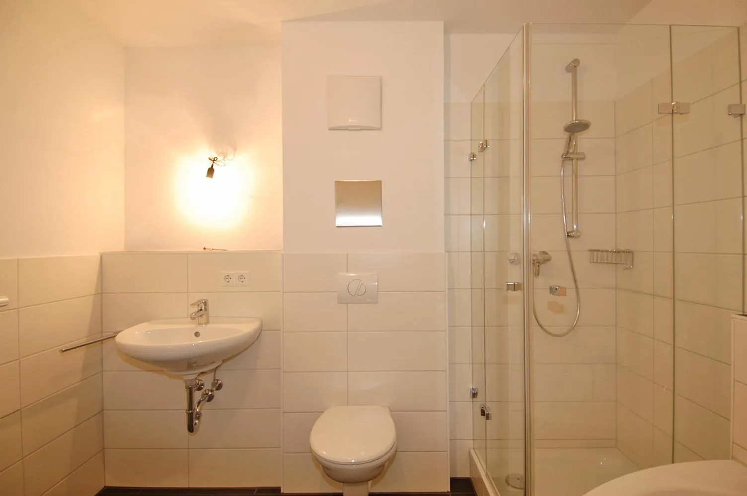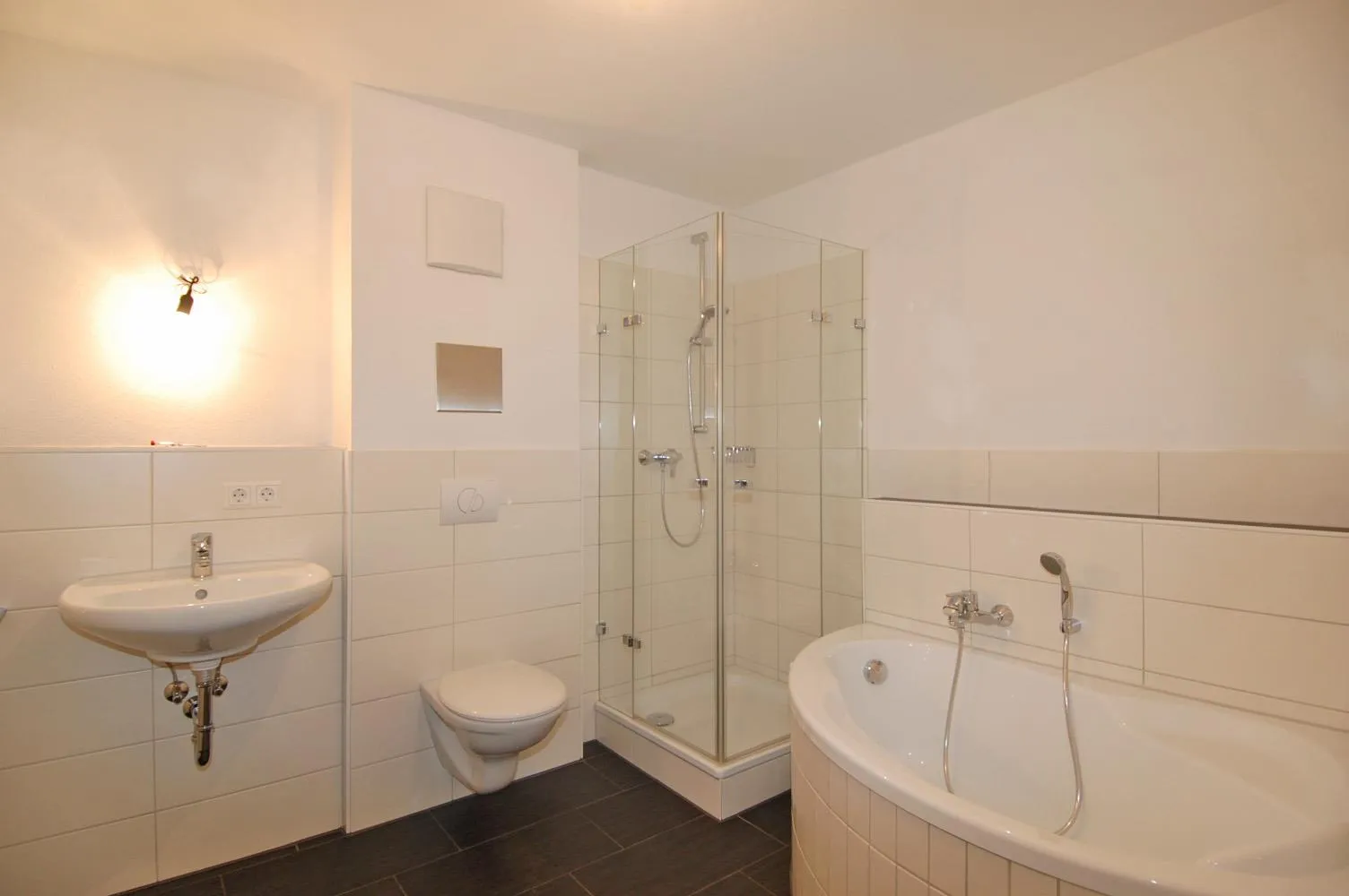 Das innenliegende Badezimmer ist halbhoch gefliest und mit Eck-Badewanne, Dusche mit Glaskabine, Waschbecken, WC und elektrischer Abluft ausgestattet. Der Anschluss für die Waschmaschine befindet sich hier im Bad.