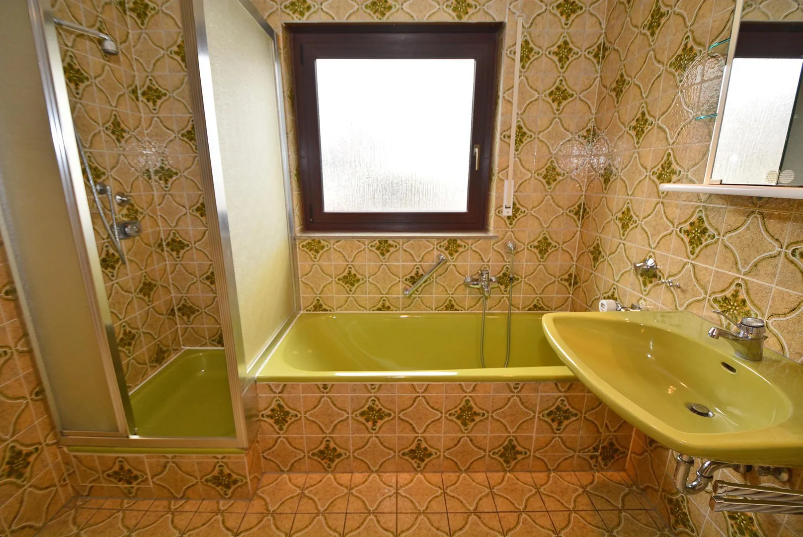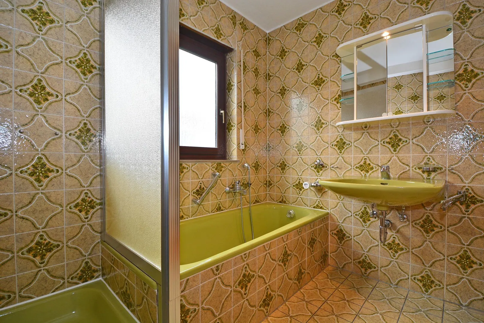 Das Bad ist im Stil der 70er Jahre gefliest und mit Badewanne, Dusche, Waschbecken und Fenster ausgestattet.