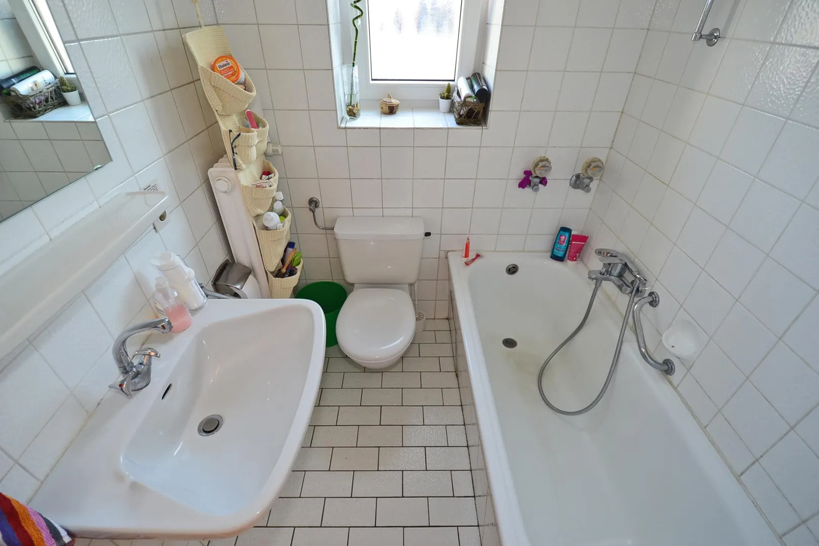 Das kompakte Bad ist fast raumhoch gefliest und verfügt über Fliesenboden, Badewanne, Waschbecken, WC und Fenster.