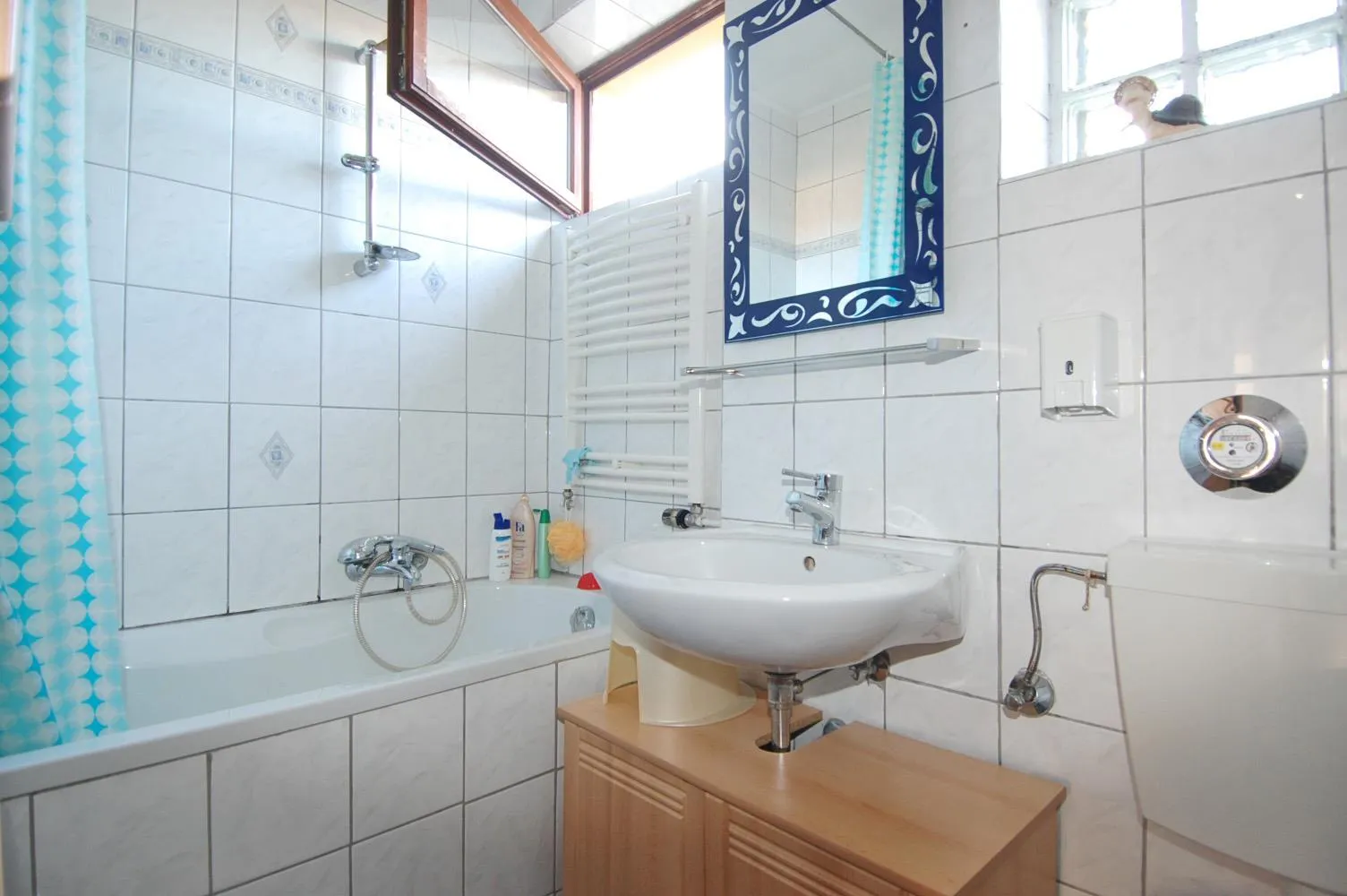 Das Badezimmer ist raumhoch gefliest und mit Badewanne, Handtuchheizkörper, Waschbecken, WC, Fenster und Glasbausteinen ausgestattet.
