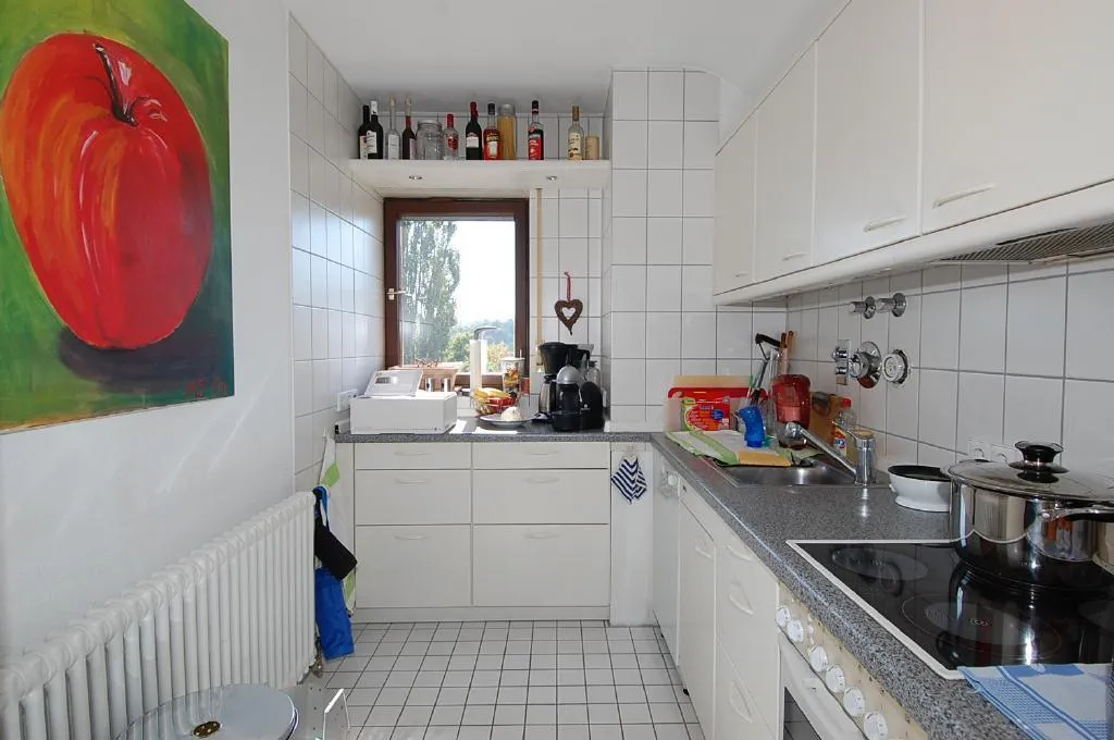 - helle Küche mit einer älteren, komplett ausgestatteten Einbauküche