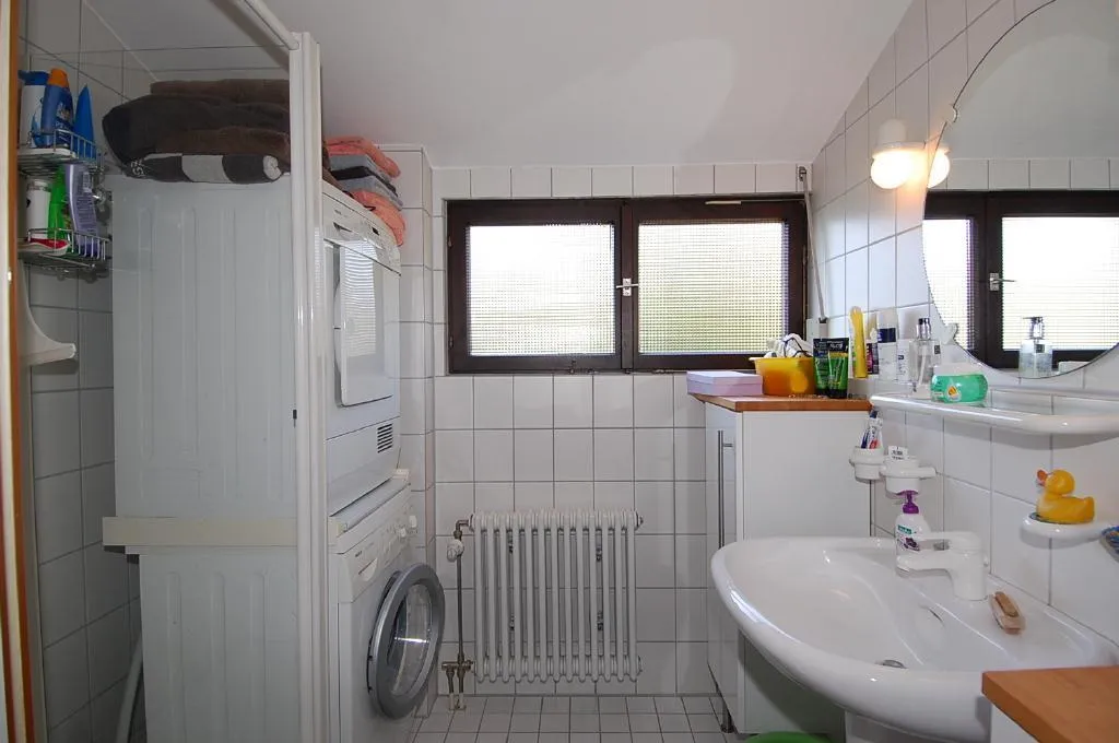 - raumhoch in weiss gefliestes Bad mit Dusche, Waschtisch, Fenster sowie Anschlüssen für Waschmaschine und Trockner