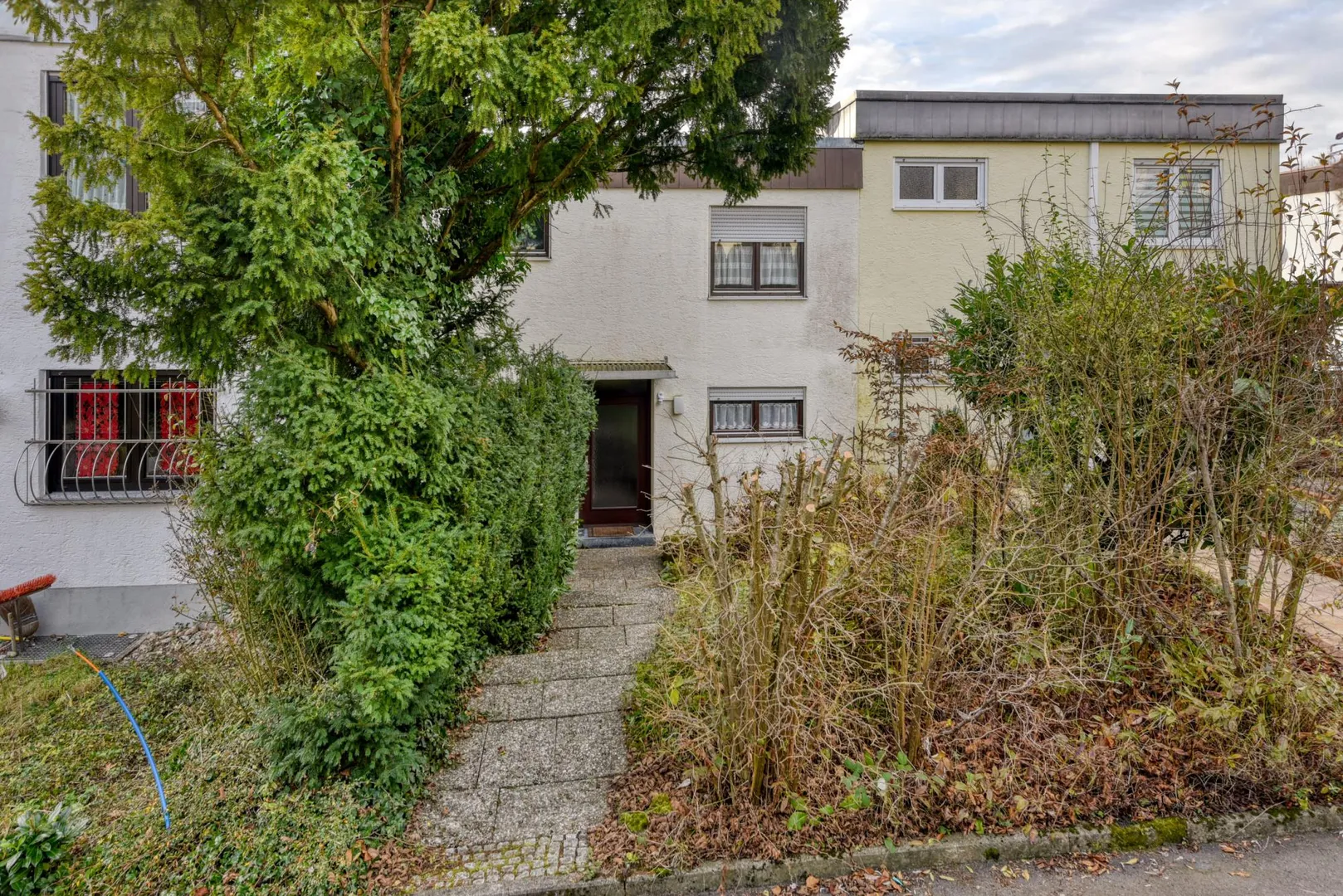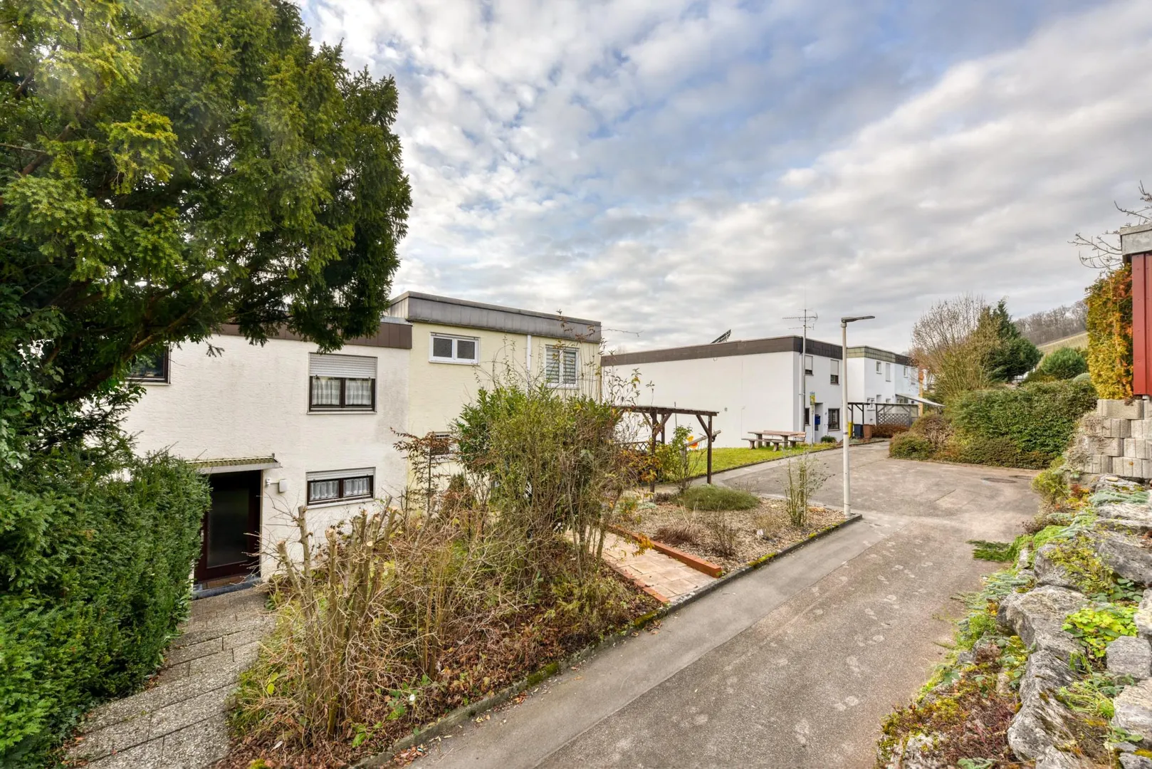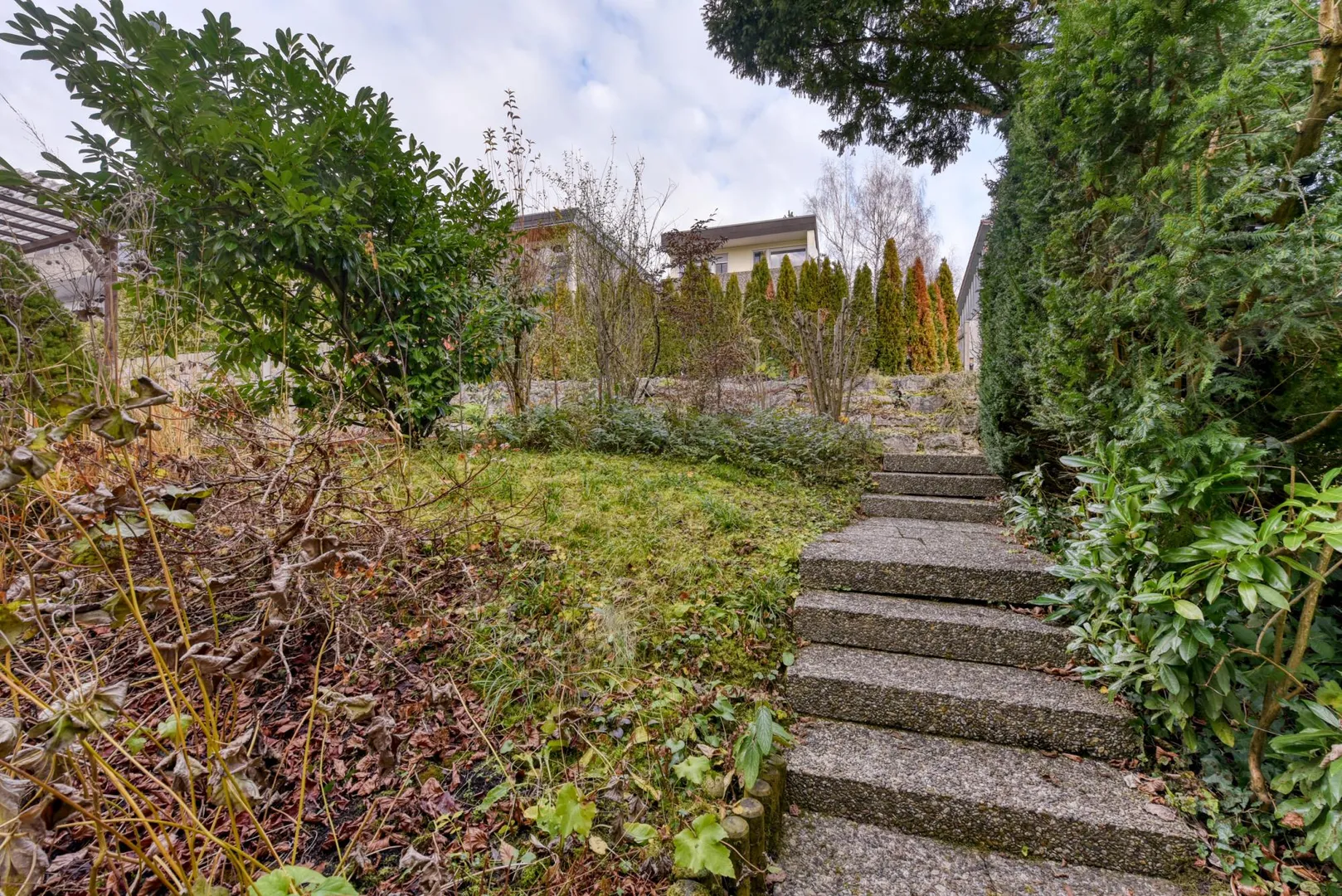 Das Grundstück ist rechteckig, nach Süd-Westen ausgerichtet und nach Süd-Westen abfallend. Der Hauseingang befindet sich auf der Nord/Ost-Seite. Dort befinden sich ein Gehweg sowie der Vorgarten. Vom Gehweg sind es 7 Stufen runter ins Haus. Das Grundstück ist ebenfalls von der Straßenseite (Süd/West-Seite) begehbar.