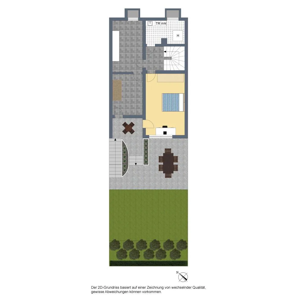 Im Gartengeschoss befinden sich auf 25 m² ein Zimmer sowie die Süd/West-Terrasse und auf 25 m² Nutzfläche zwei Kellerräume sowie der Heizraum.