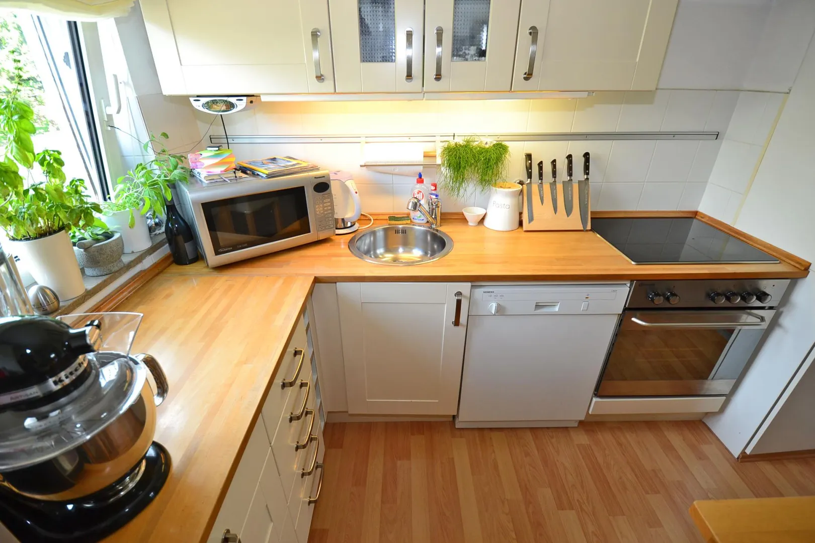 Die Einbauküche ist ausgestattet mit Cerankochfeld & Backofen, Geschirrspülmaschine sowie Ober- und Unterschränken.