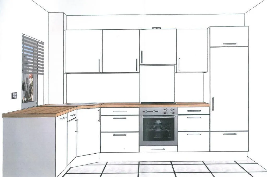Es wird eine neue Einbauküche mit Ober- und Unterschränken sowie einem Dunstabzug (Umluft) eingebaut.