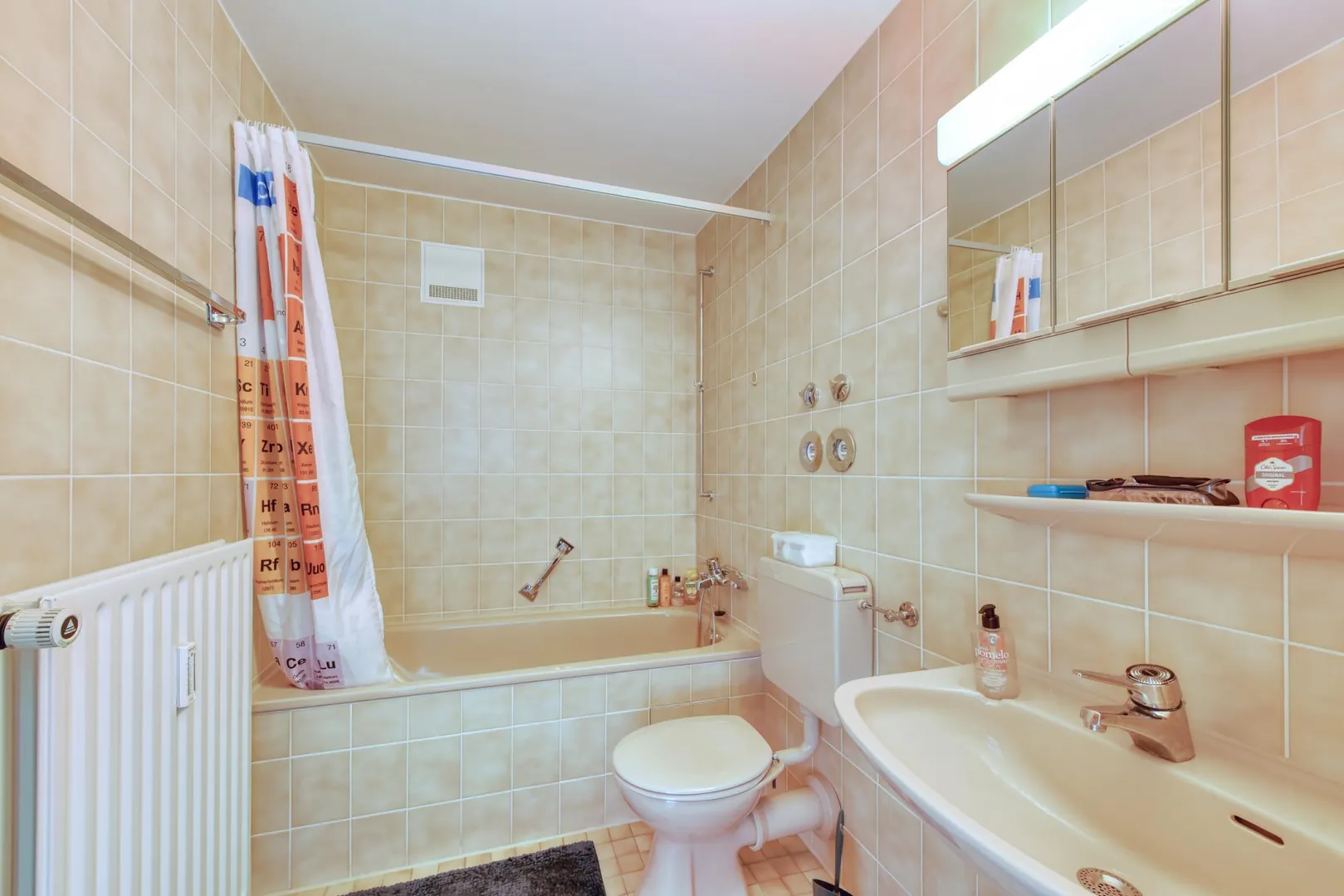 Das raumhoch geflieste Badezimmer ist ausgestattet mit einer Badewanne sowie einem WC.