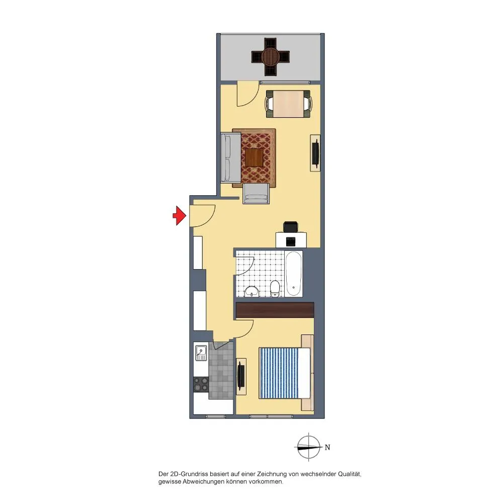 Der Grundriss ist offen gestaltet: der Wohnbereich ist zum Eingangsbereich offen. Der ca. 6 m² große und überdachte West-Balkon ist über den Wohnbereich begehbar. Das Badezimmer ist innenliegend.