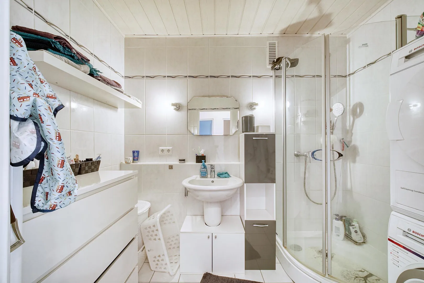 Das raumhoch geflieste Badezimmer ist ausgestattet mit einer Dusche, einem Handtuch-Heizkörper sowie einem Waschmaschinenanschluss.