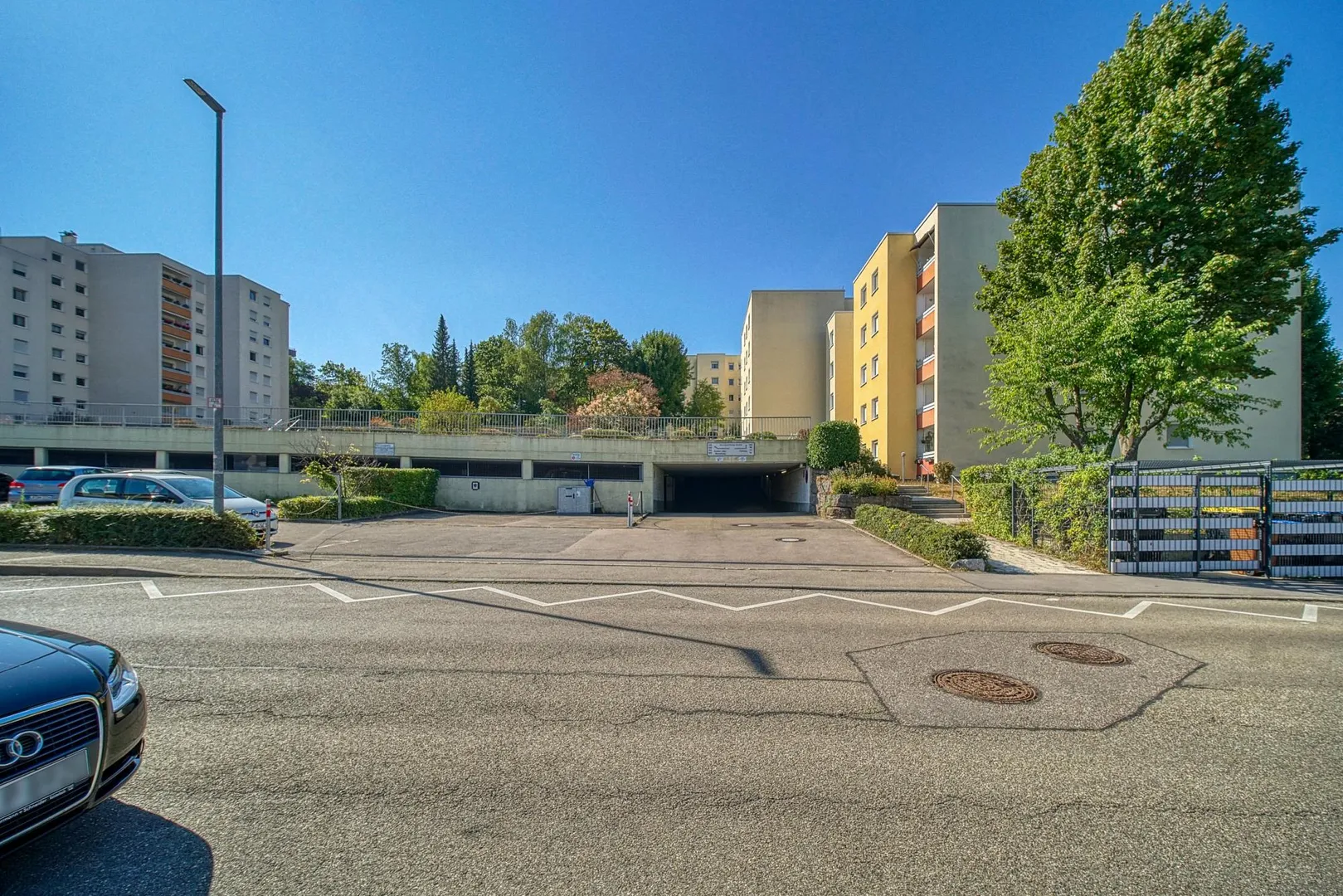 Zur Wohnung gehören ein 10,5 m² großer Abstellraum im Untergeschoss sowie eine Kfz-Box in der Tiefgarage, welche bereits mit 55 EUR in der Angabe der Kalt-Miete enthalten ist.