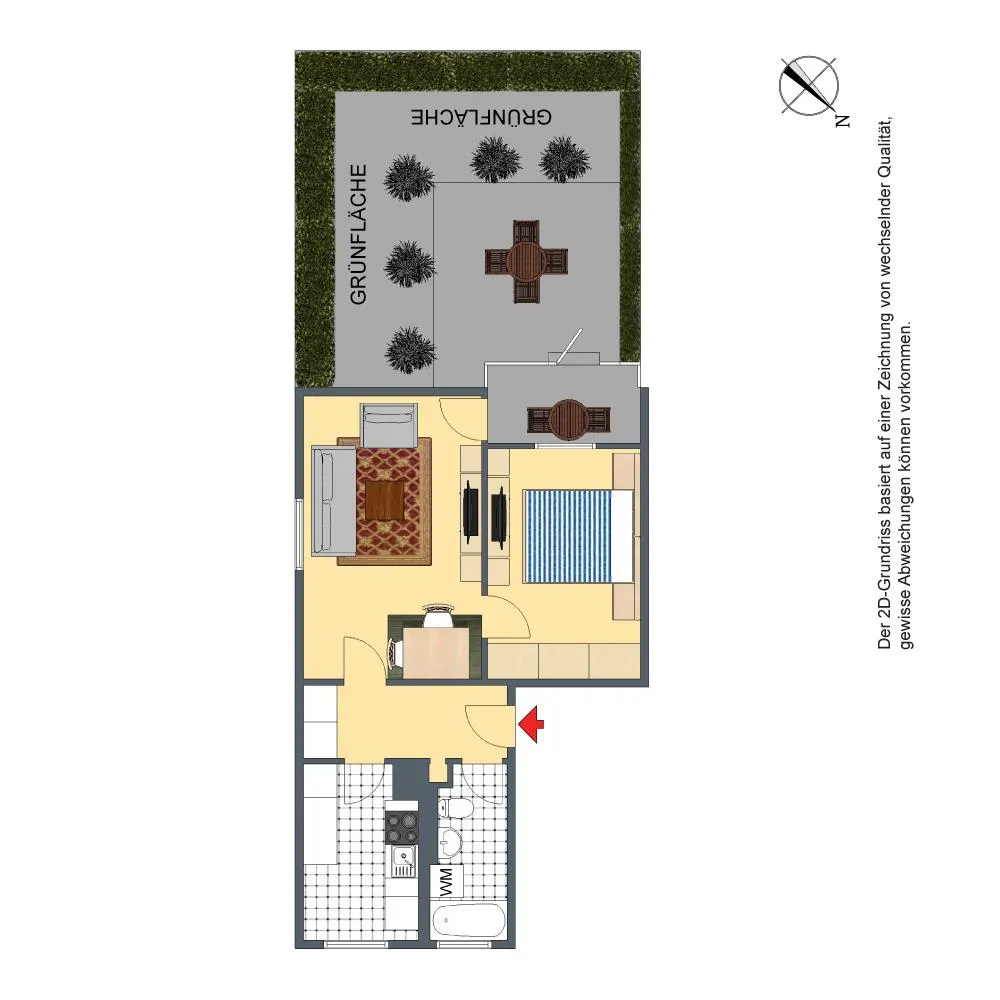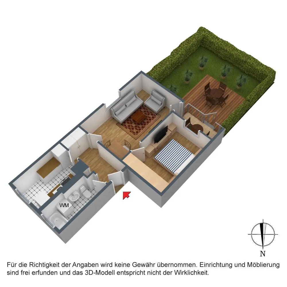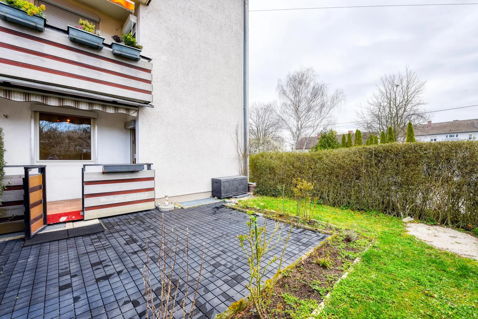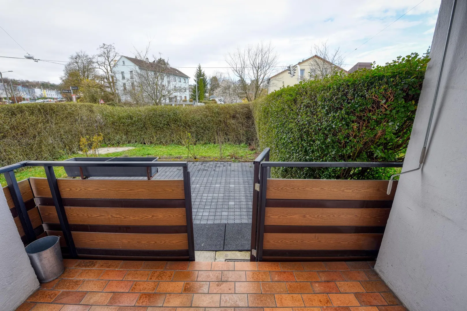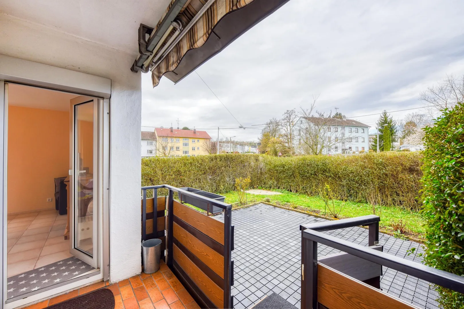 Vom Wohnzimmer ist der ca. 3,7 m² große und überdachte Süd/West-Balkon mit Markise begehbar. Die ca. 12 m² große Terrasse sowie die Grünfläche sind über den Balkon begehbar.