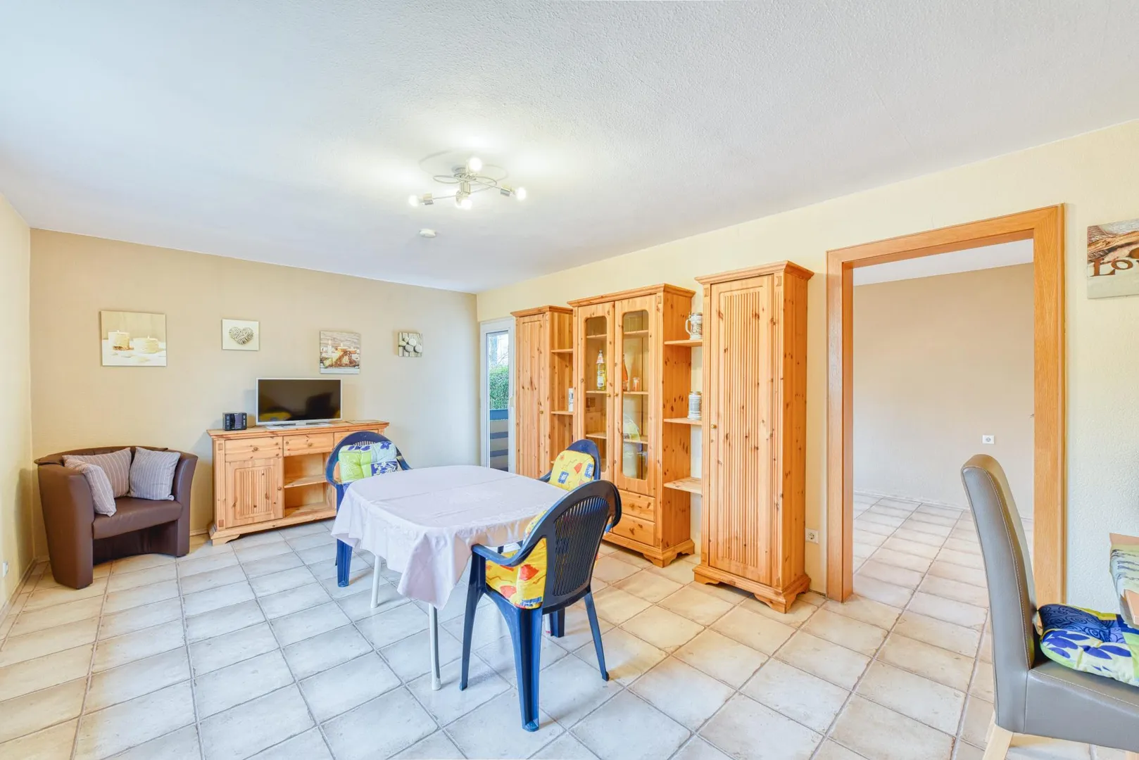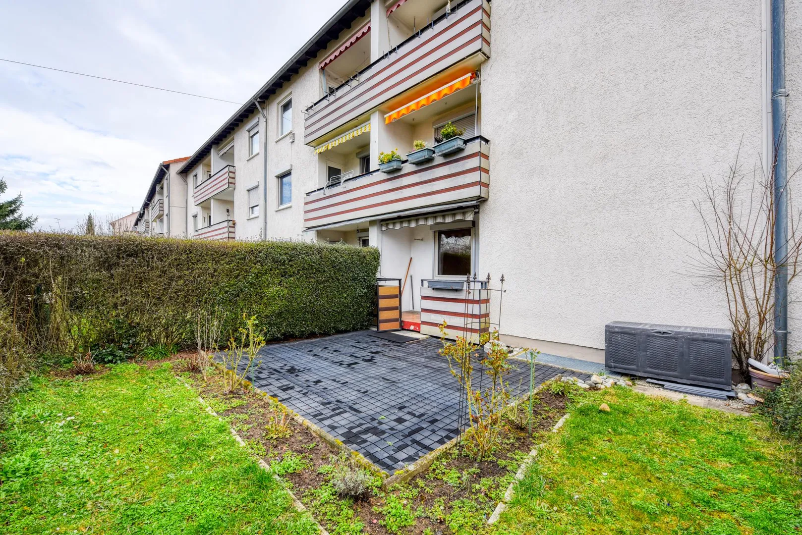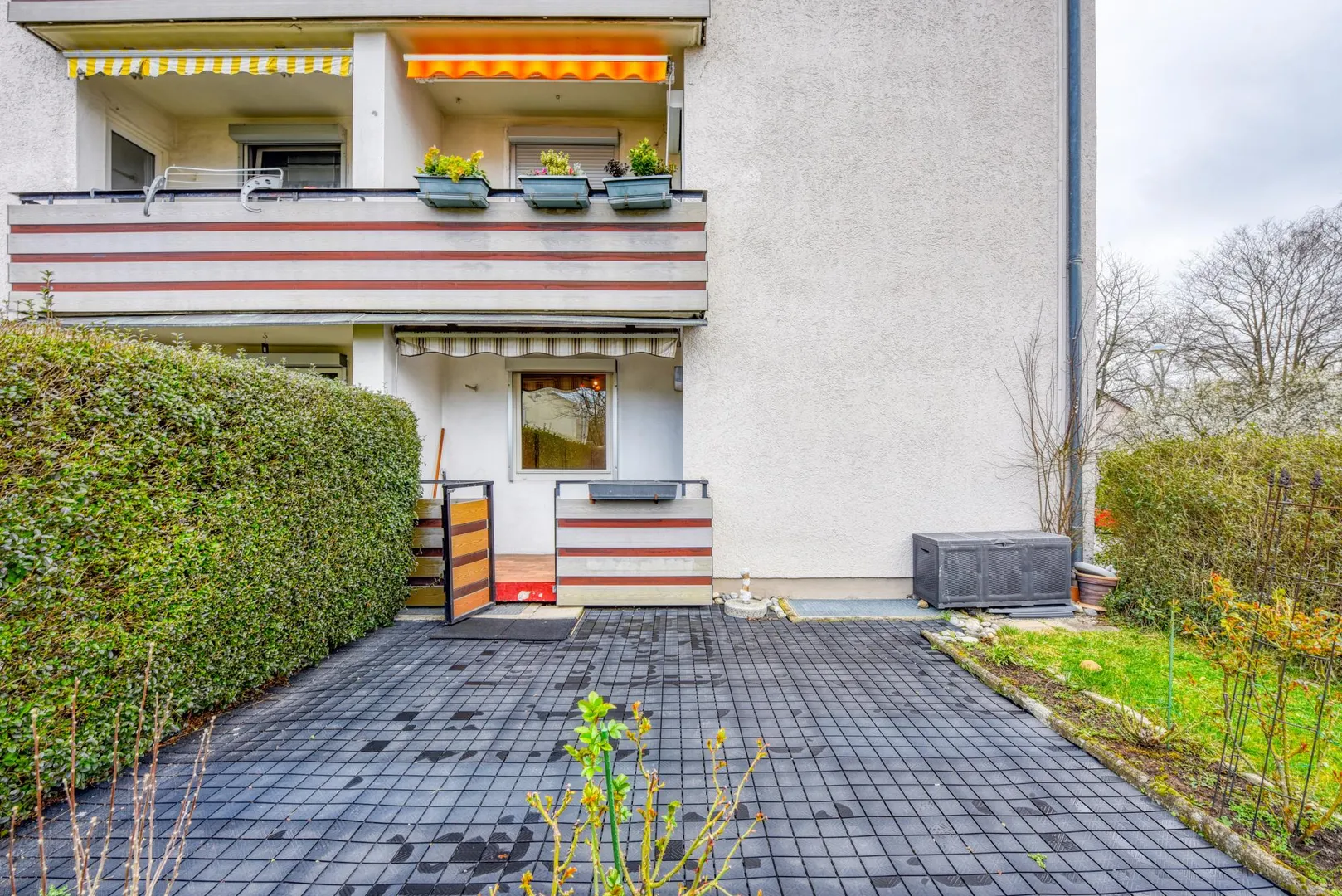 Diese sonnige und modernisierte 2-Zimmer-Wohnung mit Balkon, Terrasse und Grünfläche (Sondernutzungsrecht) befindet sich im Hochparterre (Erdgeschoss).
