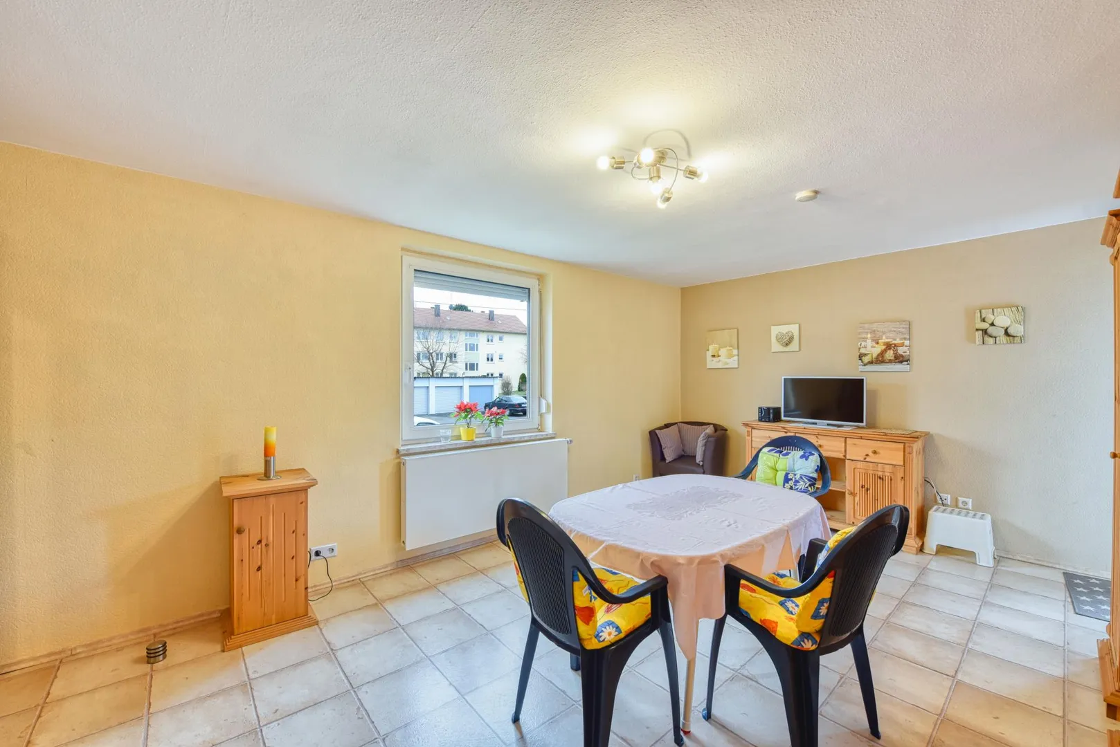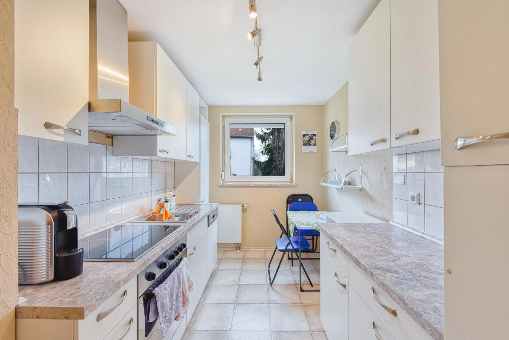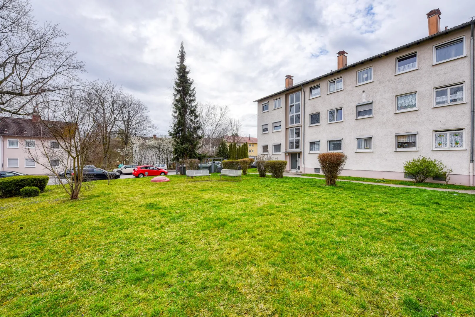 Diese sonnige und modernisierte 2-Zimmer-Wohnung mit Balkon, Terrasse und Grünfläche (Sondernutzungsrecht) befindet sich im Hochparterre (Erdgeschoss) eines 6-Familien-Reiheneckhauses auf Erbbaurecht.
