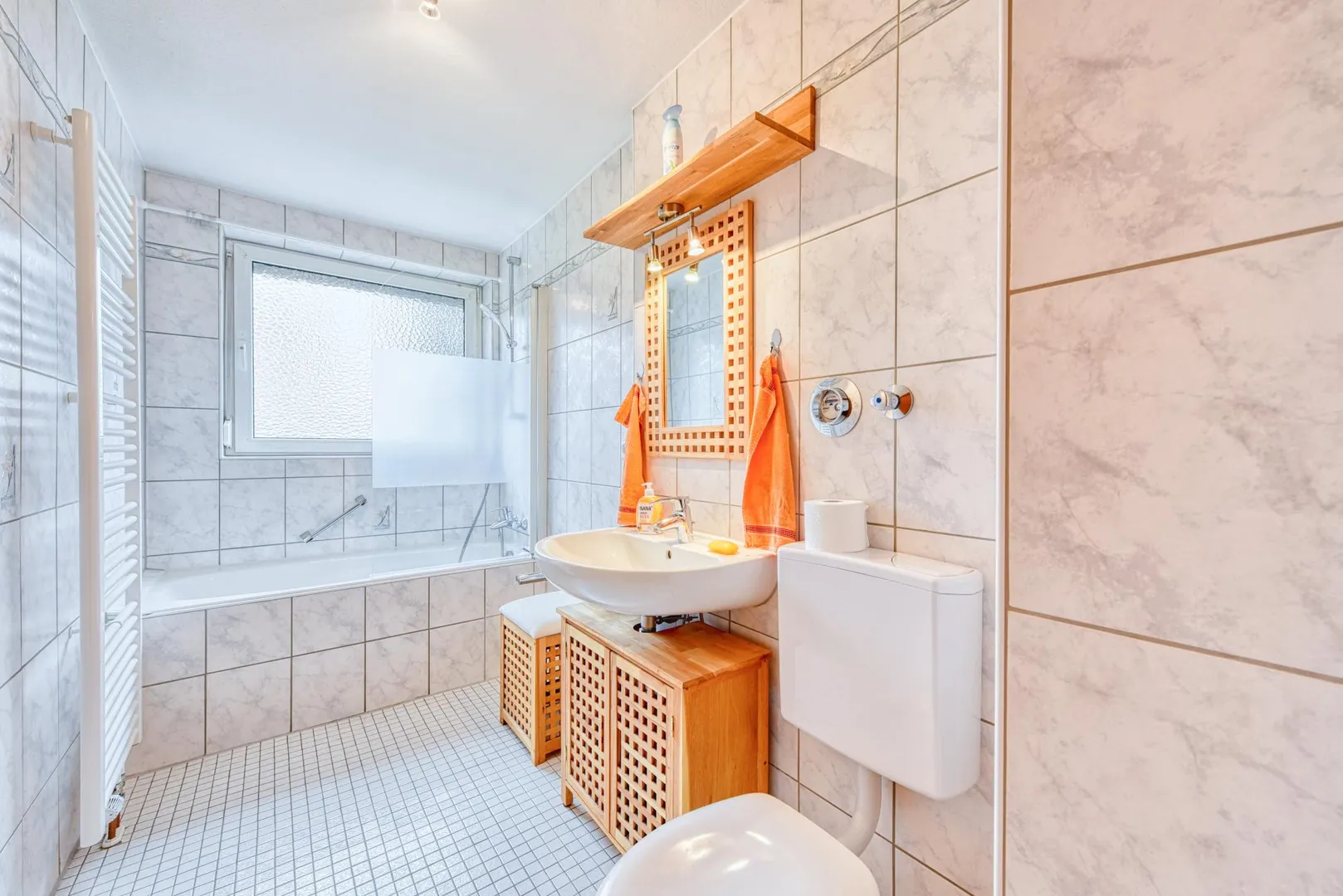 Das raumhoch geflieste Badezimmer mit Fenster ist ausgestattet mit einem Fliesenboden, einer Badewanne, einem WC, einem Handtuch-Heizkörper sowie einem Waschmaschinen-Anschluss. Die Waschmaschine kann auch im gemeinschaftlichen Wasch-/Trockenraum angeschlossen werden.
