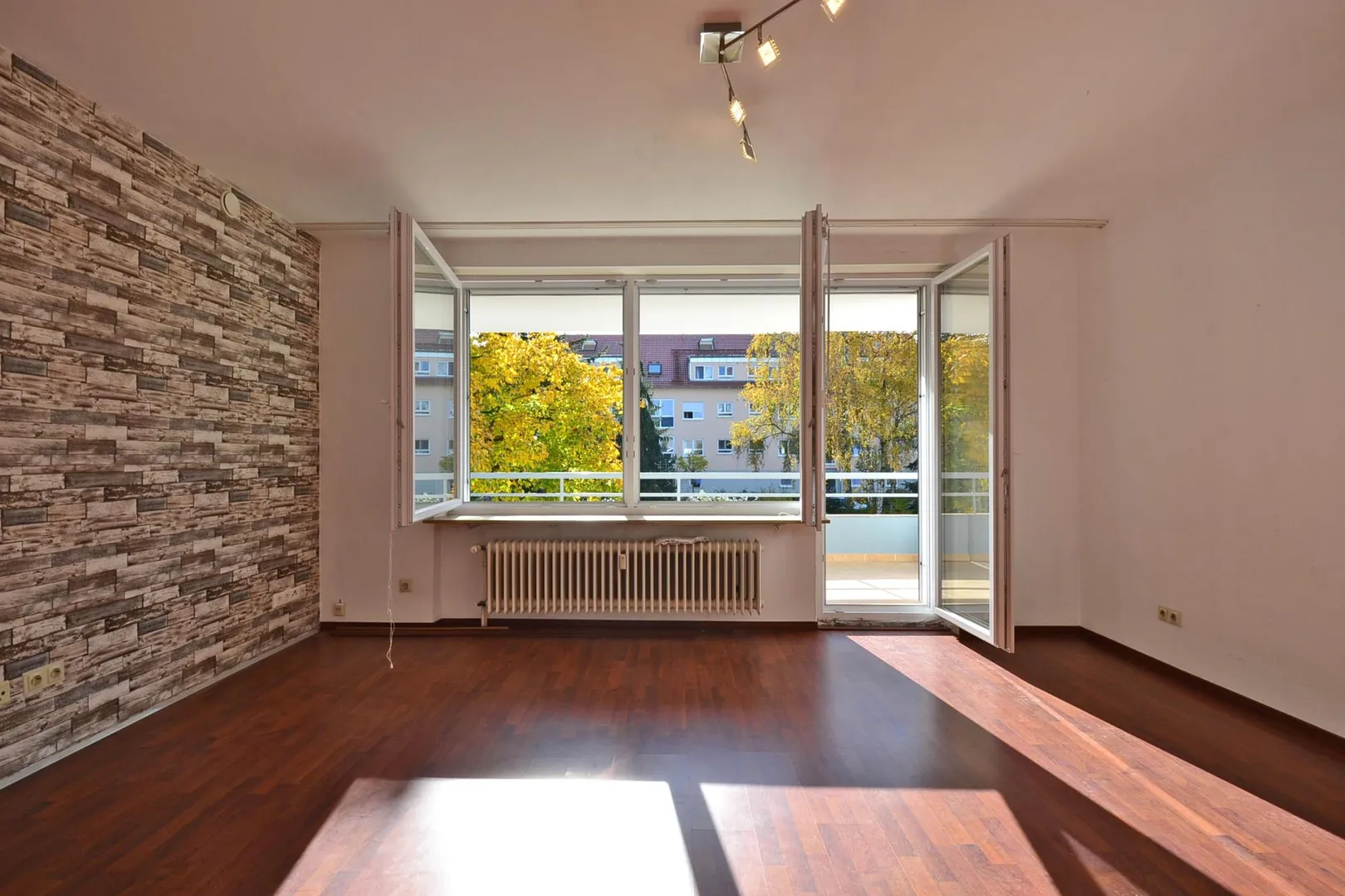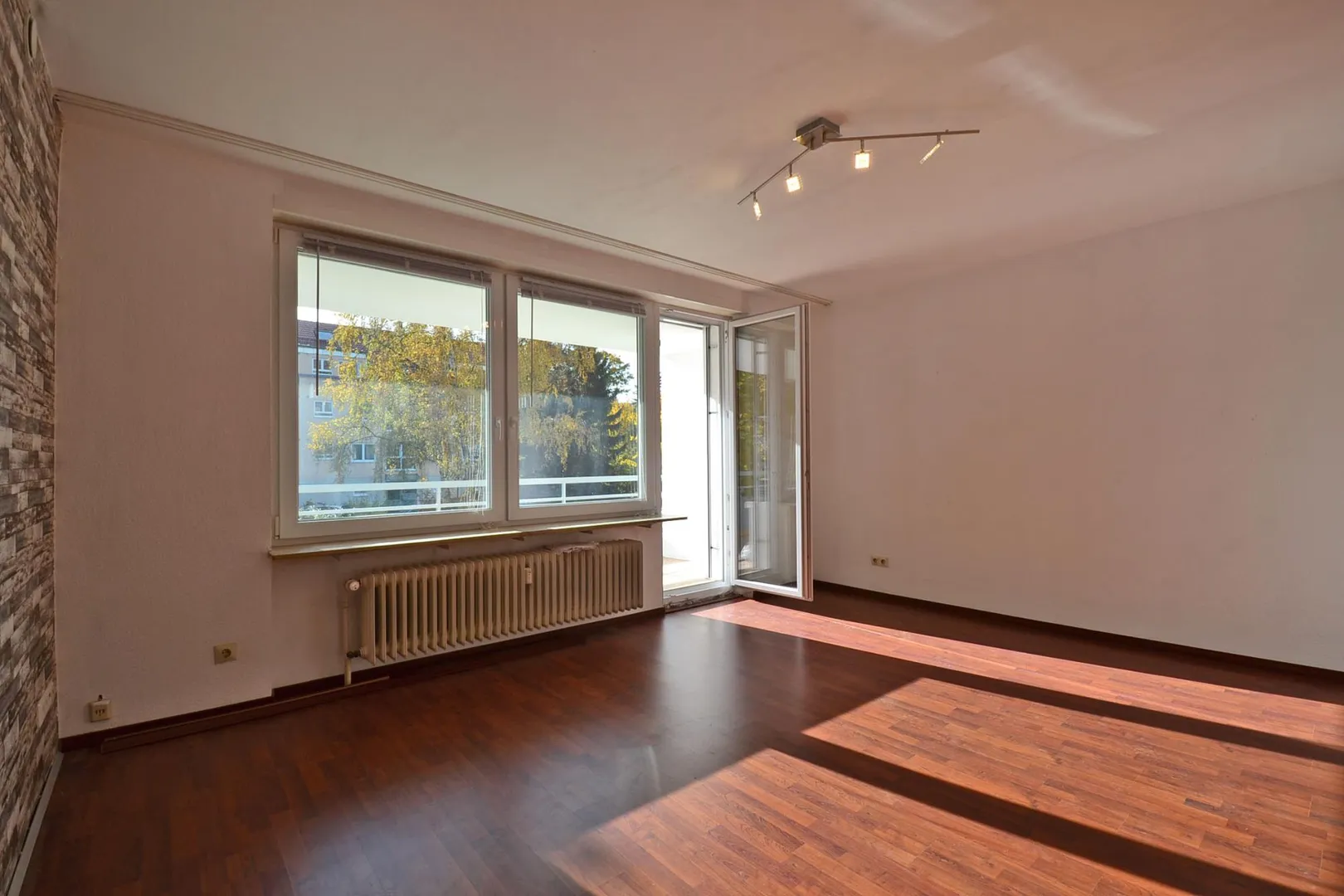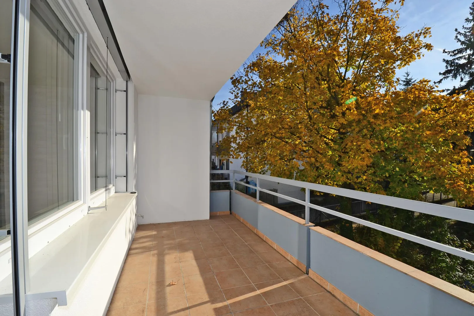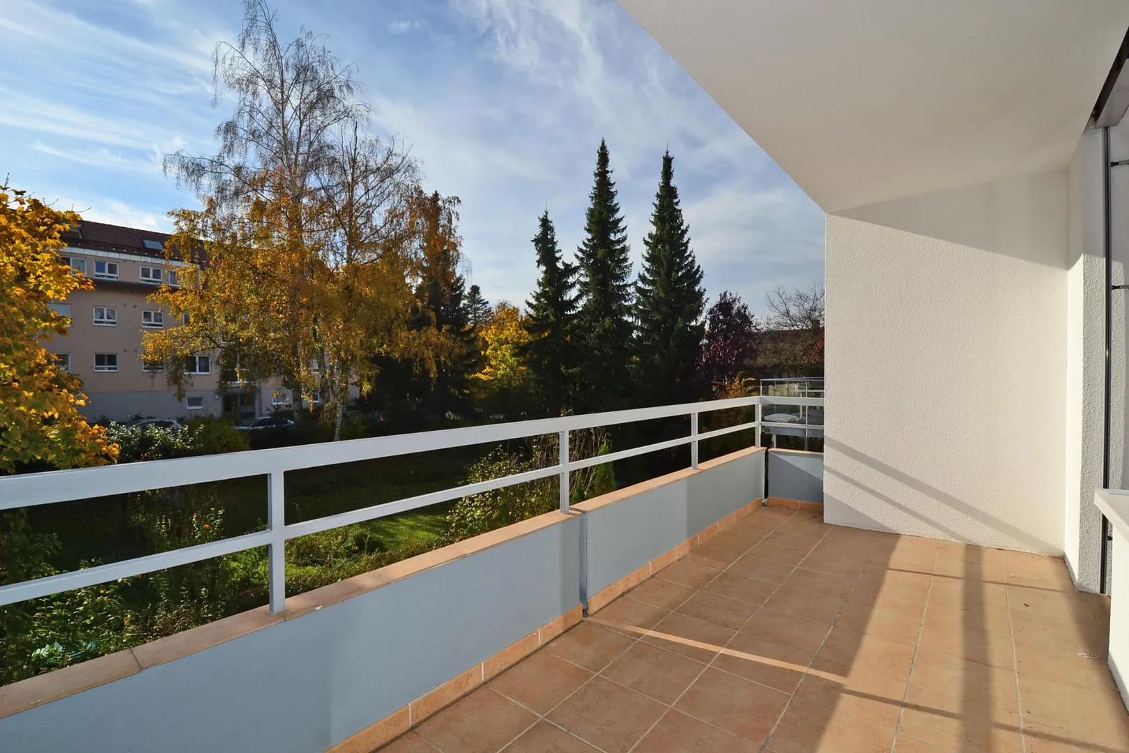 Von hier aus gelangen Sie auf den 8 m² großen Süd-Balkon. Er ist überdacht und bietet einen Ausblick auf die grüne Umgebung.
