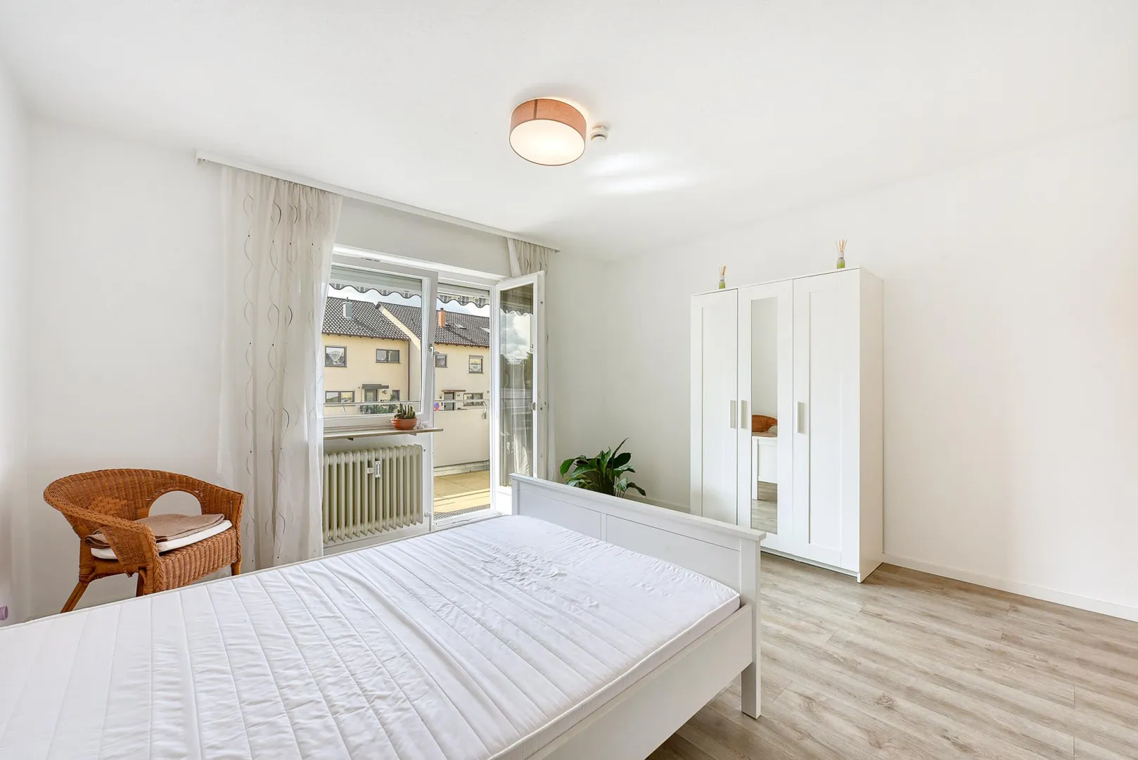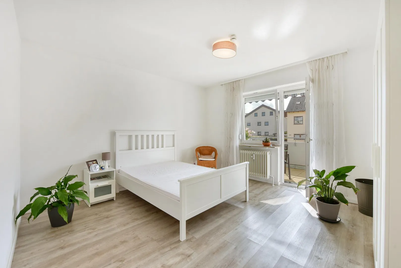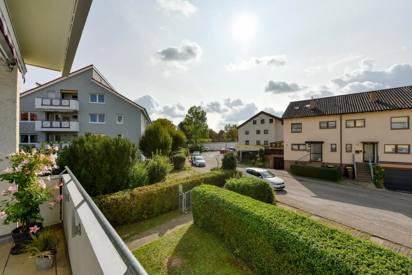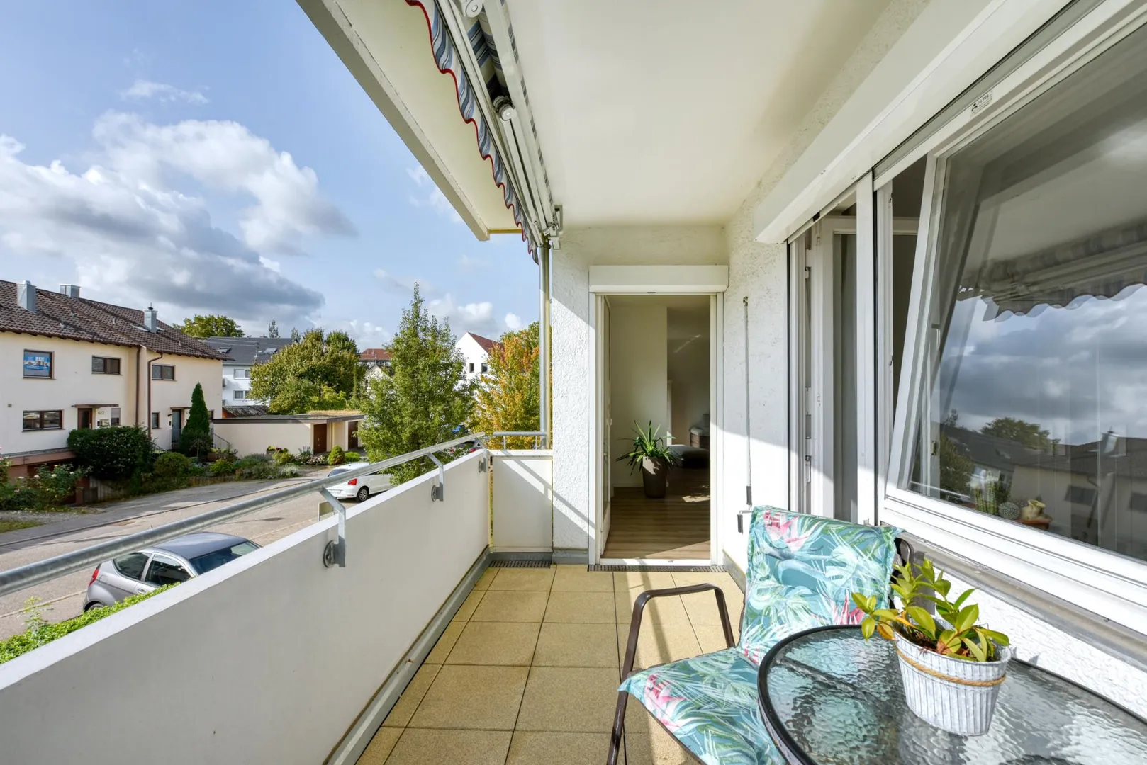 Der ca. 7 m² große und überdachte Balkon ist nach Süden ausgerichtet und ist mit einer Markise ausgestattet. Der Balkon ist über das Wohnzimmer sowie über das Schlafzimmer begehbar.