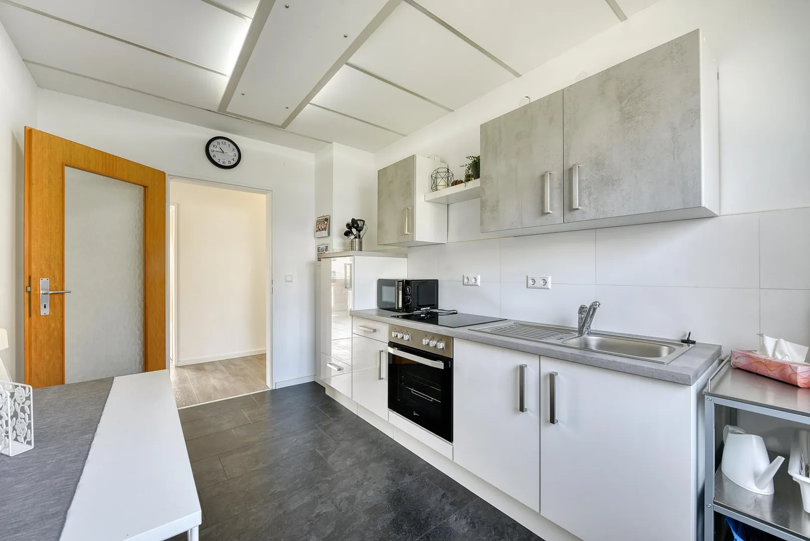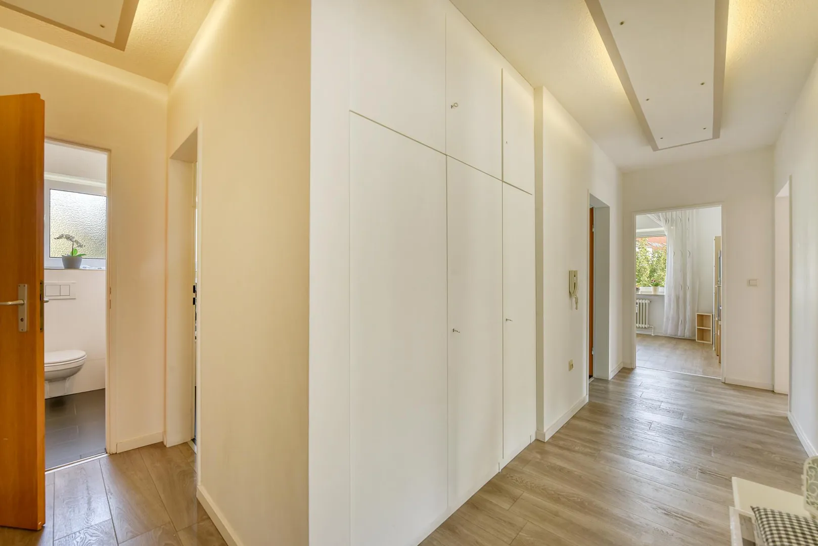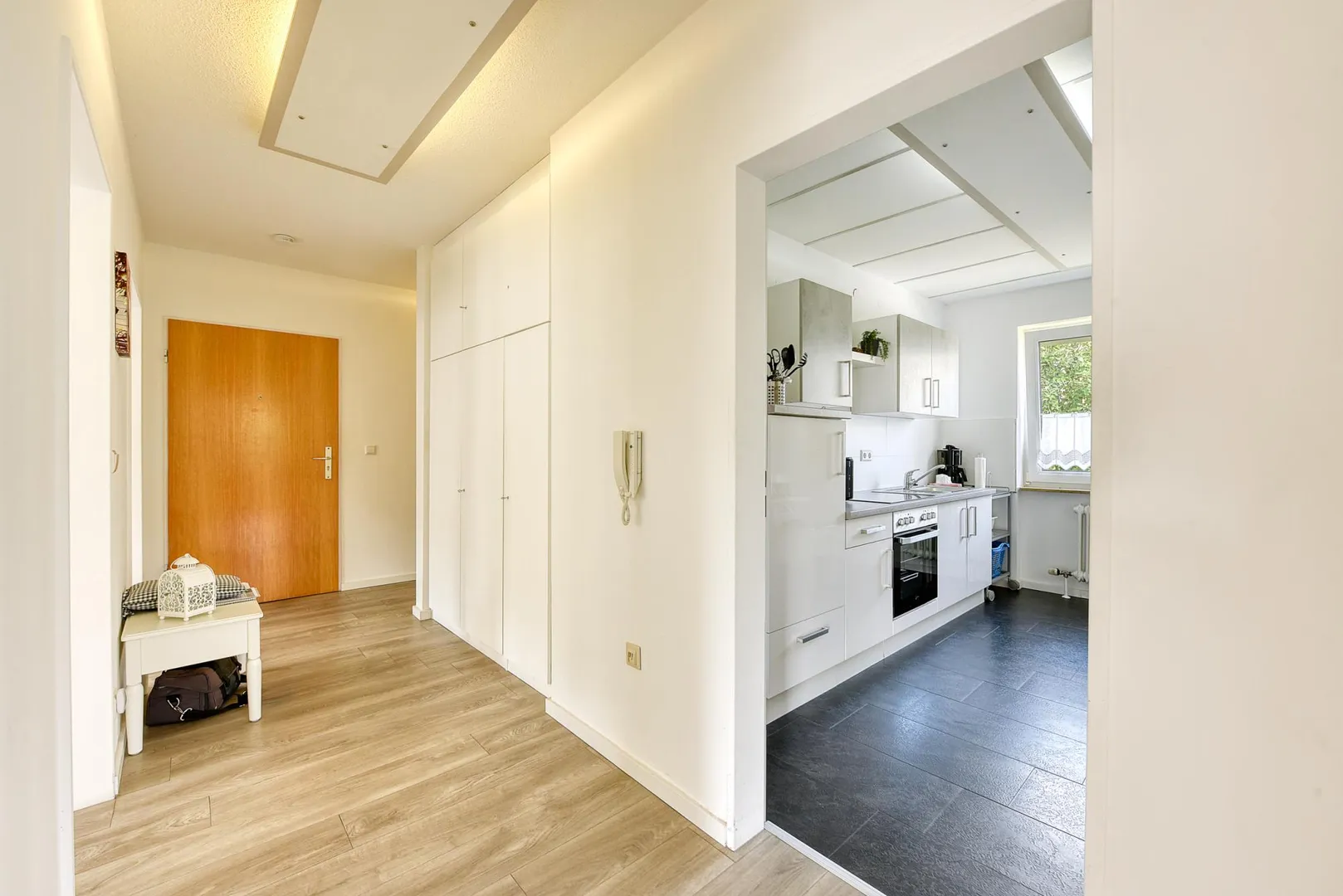 Der Flur ist ausgestattet mit einem Einbauschrank und einem Deckensegel. Die Küche ist ebenfalls mit einem Deckensegel ausgestattet.