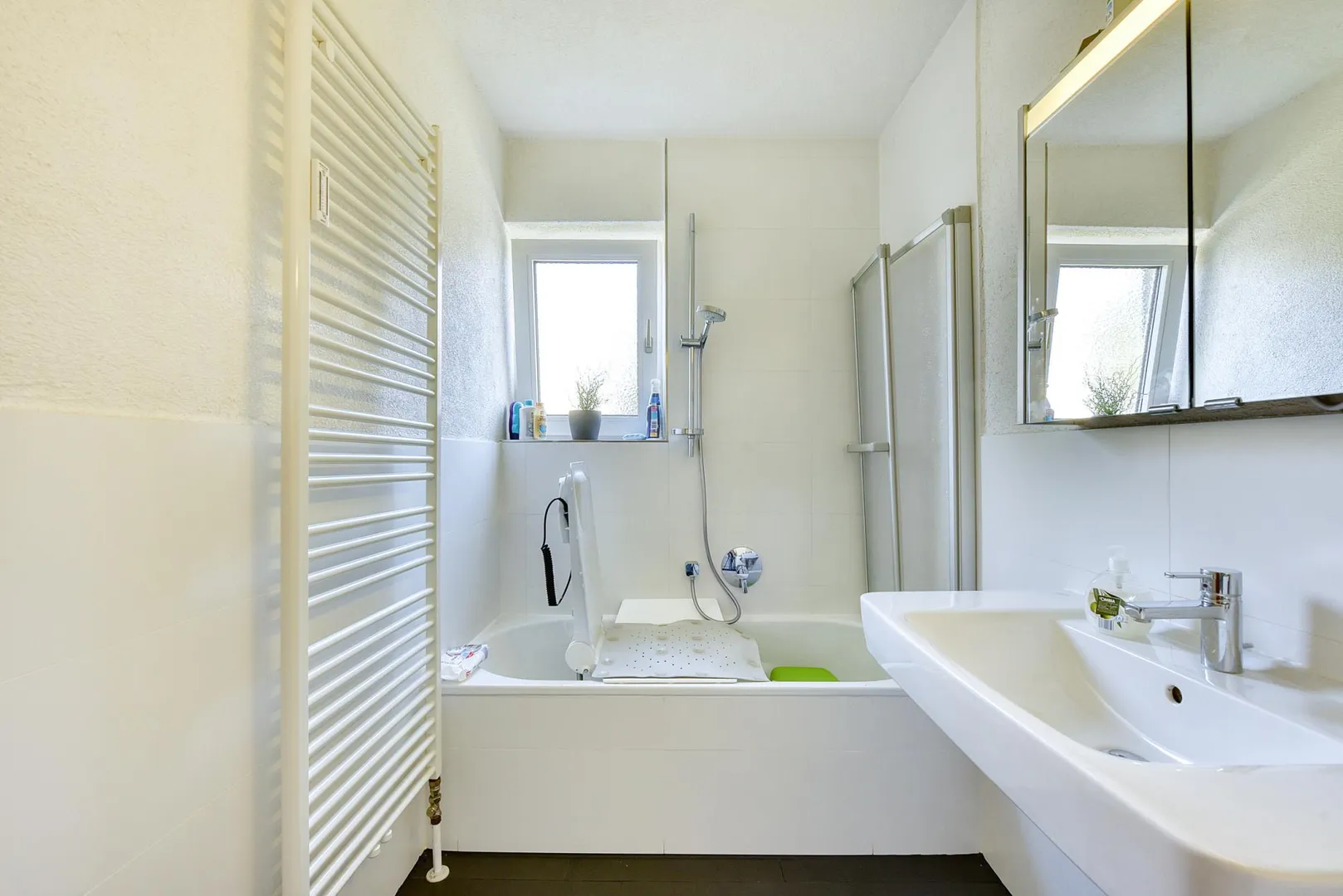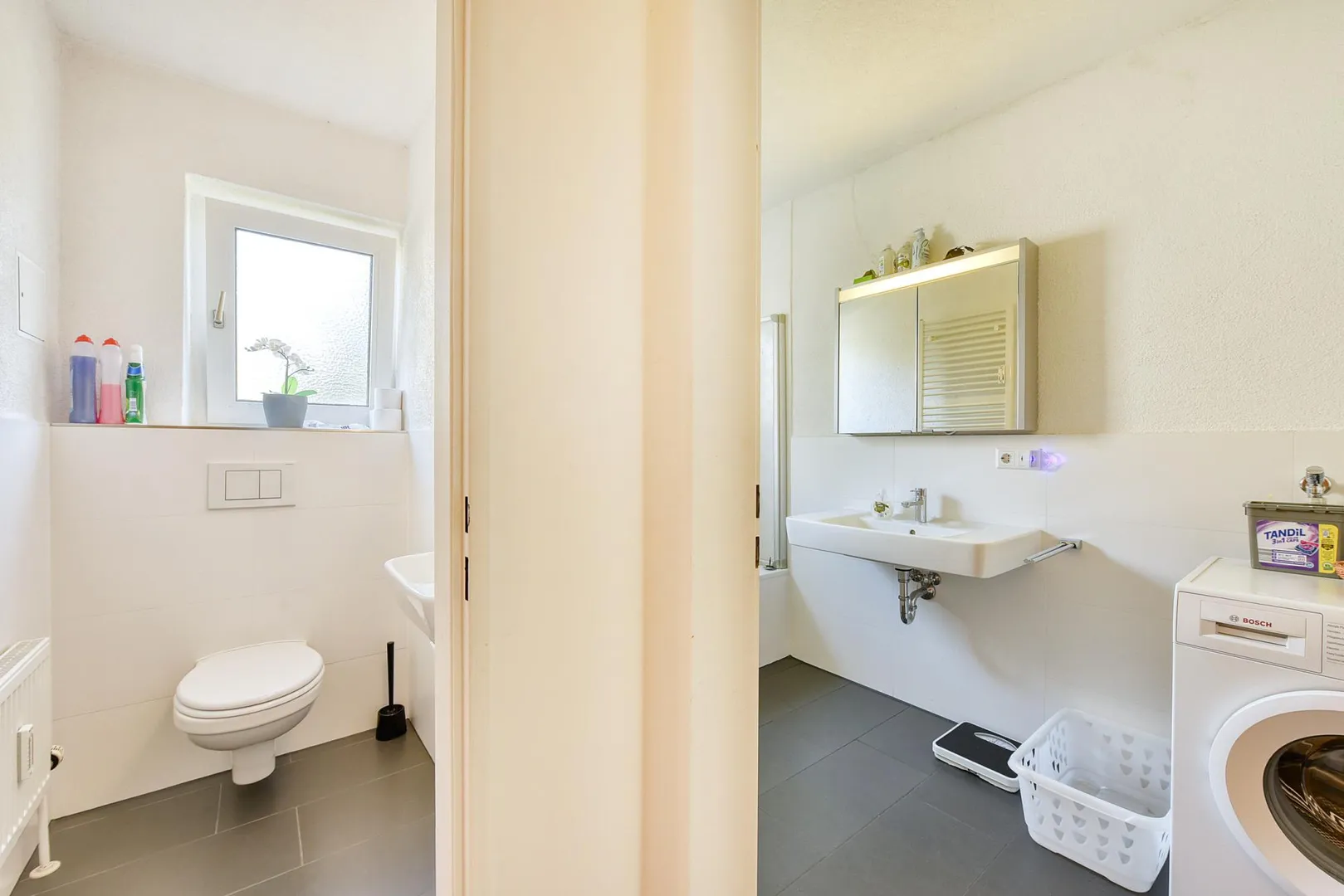 Das teilweise raumhoch geflieste Badezimmer mit Fenster ist ausgestattet mit einer Badewanne, einem Fliesenboden, einem Handtuch-Heizkörper, einem Spiegelschrank mit Beleuchtung sowie mit Waschmaschinenanschluss. Das geflieste WC mit Fenster ist separat.