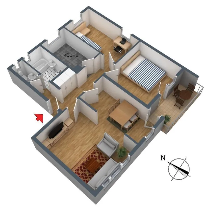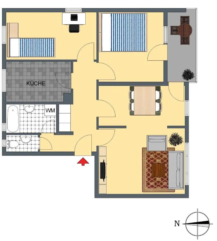 Das Wohnzimmer und das Schlafzimmer sind nach Süden ausgerichtet. Der Grundriss der Wohnung ist sehr gut. Alle Räume sind direkt vom Flur begehbar.
